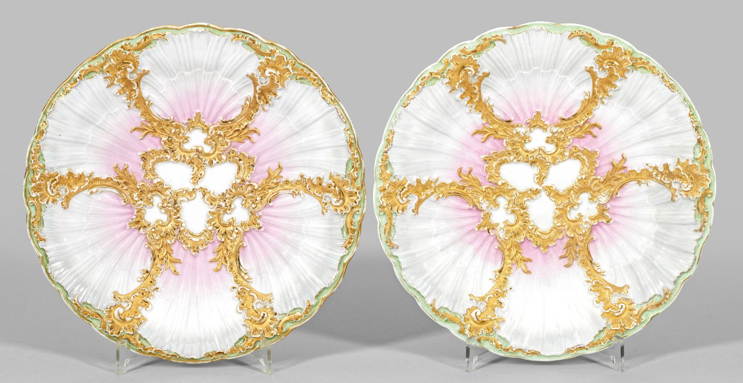 Runde, gemuldete Form. Reliefierte Fahne in Form angedeuteter Blütenblätter, von Rocaillereserven gerahmt. Polychrome Staffage und Goldbronzedekor. Gold ber., rest.; Schwertermarke. D. 31 cm.