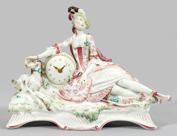 Auf rechteckig rocailliertem Sockel sitzende junge Dame im mit Indianischen Blüten geschmückten Rokokokostüm und Federhut; Mit ihrem ausgestreckten rechten Arm auf die kugelige Uhr gestützt sowie zärtlich ihren Hund streichelnd. Der Pfeil zu ihren Füßen und das auf dem Knie lagernde Horn weisen sie als Jagdgöttin Diana aus. Polychrome Malerei mit Goldkonturierung. Entw. Paul Scheurich, 1937. Modell-Nr. A 1193. Uhrengehäuse mit arabischen Ziffern und Messingzeigern. Werk mit Schlüsselaufzug. Haarriss. Schwertermarke. H. 27,5 cm. 37 cm x 16 cm.