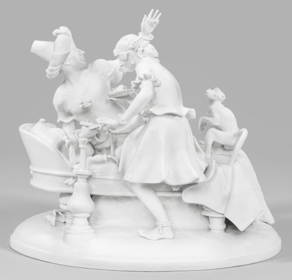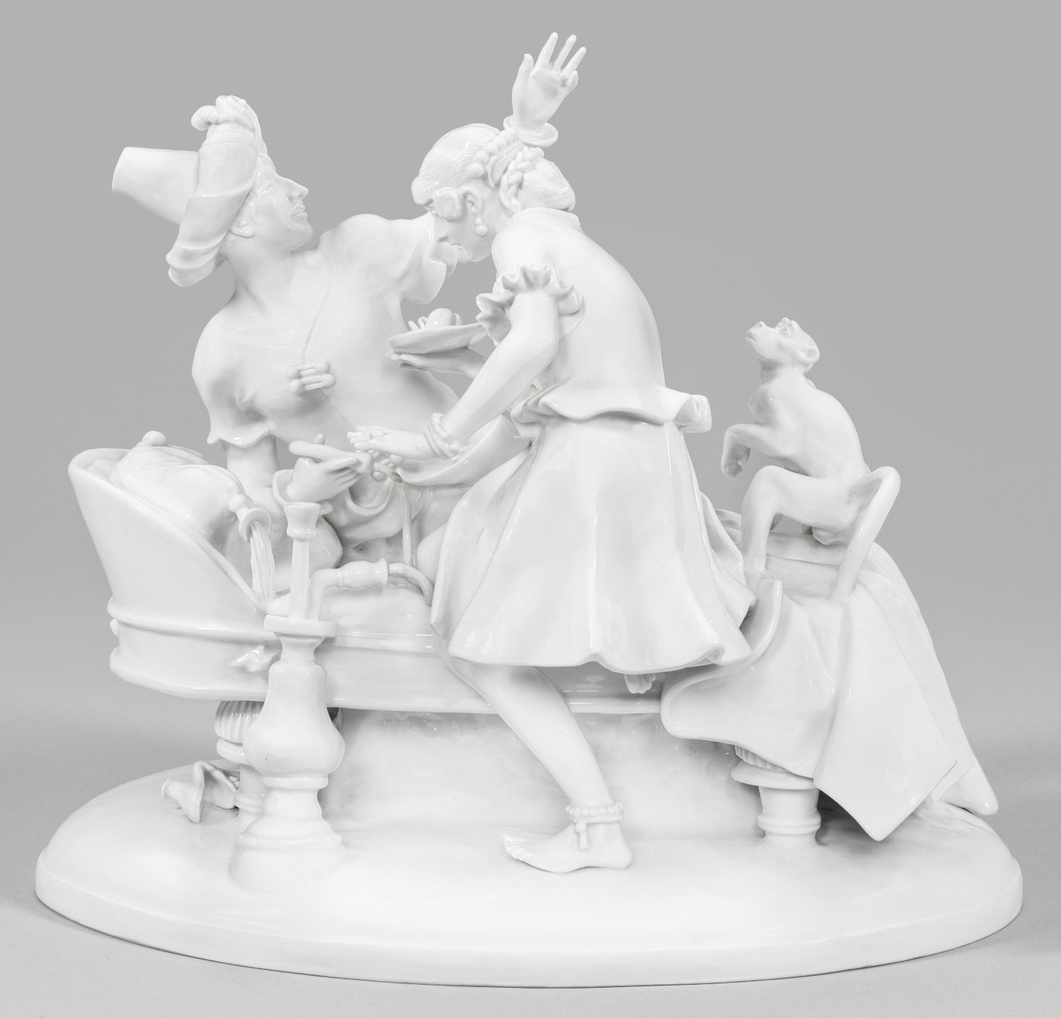 Weißporzellan. Auf einem Ovalsockel stehender Diwan mit der Darstellung eines lagernden Sultans, Wasserpfeife rauchend und mit erhabenem Gestus in Richtung des vor ihm hockenden und den Herrscher aufmerksam beobachtenden Äffchens weisend. Eine sich auf der Liege abstützende Haremsdame beugt sich dem Sultan entgegen, um ihm eine Schale mit Obst zu servieren. Entw. Franz Christophe, um 1930. Entw-Bez.; Modell-Nr. A 1135. Besch./rest; Schwertermarke. 30 cm x 37 cm.