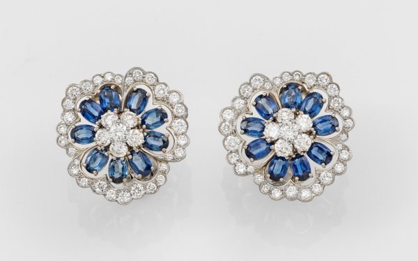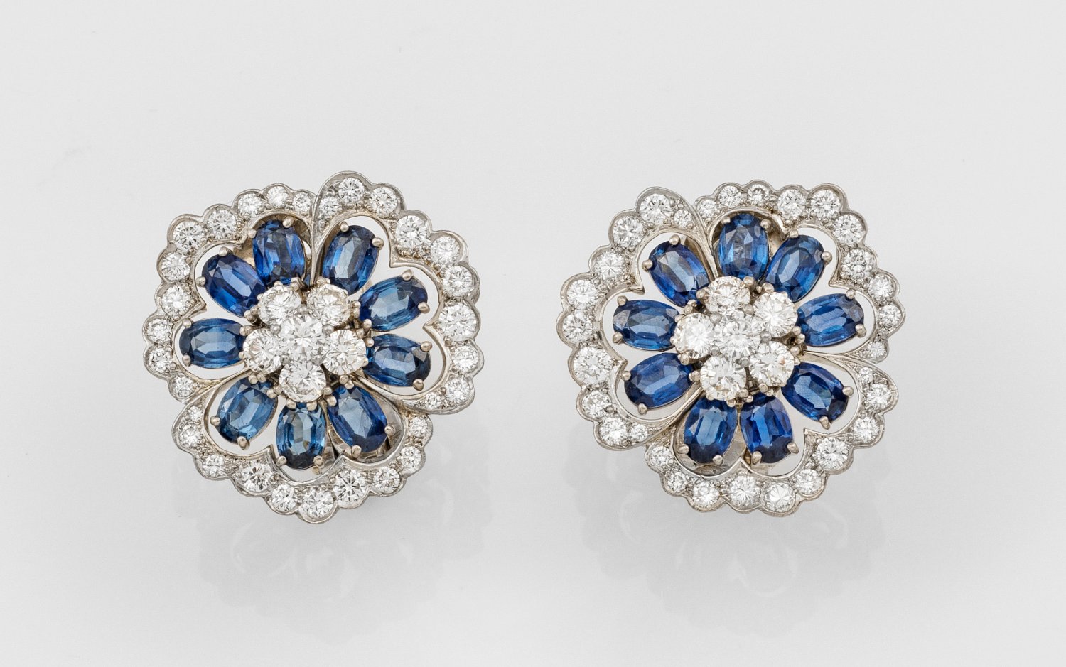 Pair of earrings by Van Cleef & Arpels, set with sapphires approx. 8,50 ct. and brilliants approx. 3,65 ct. (F-G/vvs), in platinum. Maker's mark.