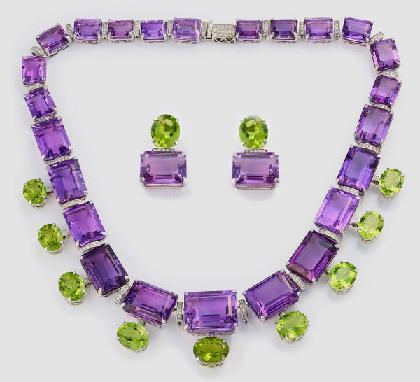 Collier und Paar korrespondierende Ohrringe. Weißgold, gest. 14 ct.; Schauseitig besetzt mit Amethysten von zus. ca. 269,42 ct. und apfelgrünen Peridots von zus. ca. 49,84 ct., akzentuiert durch kleine Brillanten von zus. ca. 1,76 ct.; Ges.-Gew. ca. 150,82 g.