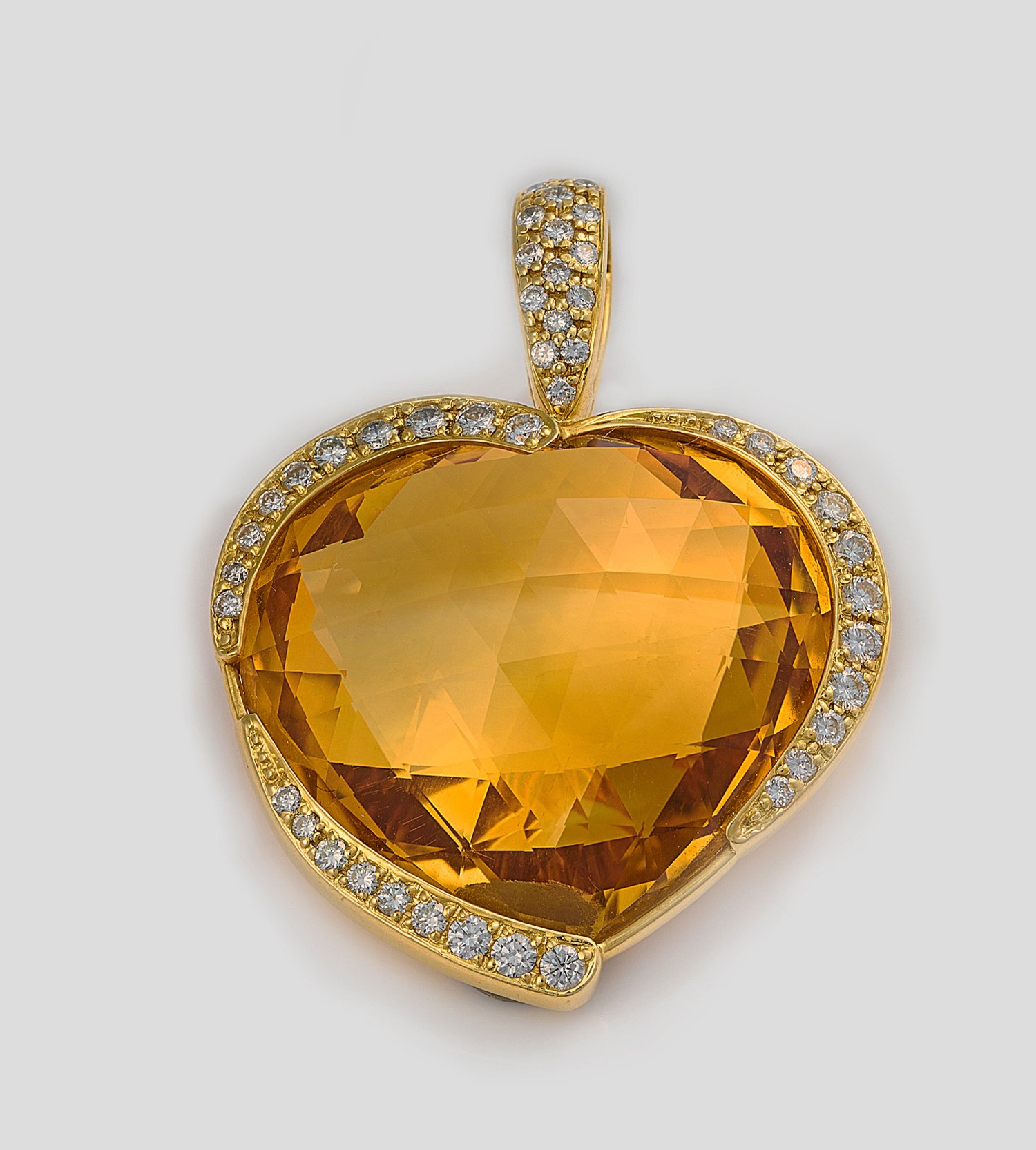 Heart pendant by Patz, set with gold yellow citrine approx. 68 ct. and brilliants approx. 0,80 ct. (F-G/vsi), in 18 k gold. Original box and invoice.