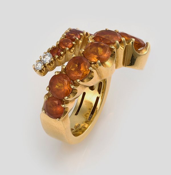 Gelbgold, gest. 750. Schauseitig besetzt mit orangegelben Citrinen von zus. ca. 6,50 ct., akzentuiert durch 2 Brillanten von zus. ca. 0,10 ct.; Herstellerzeichen. Gew. ca. 19,09 g.