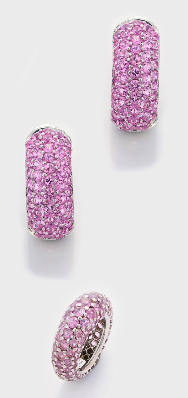 Paar Ohrclips und korrespondierender Bandring. Weißgold, gest. 750. Besetzt mit pinkfarbenen Saphiren von zus. ca. 27 ct. in Pavéfassung. Ges.-Gew. ca. 50,81 g.