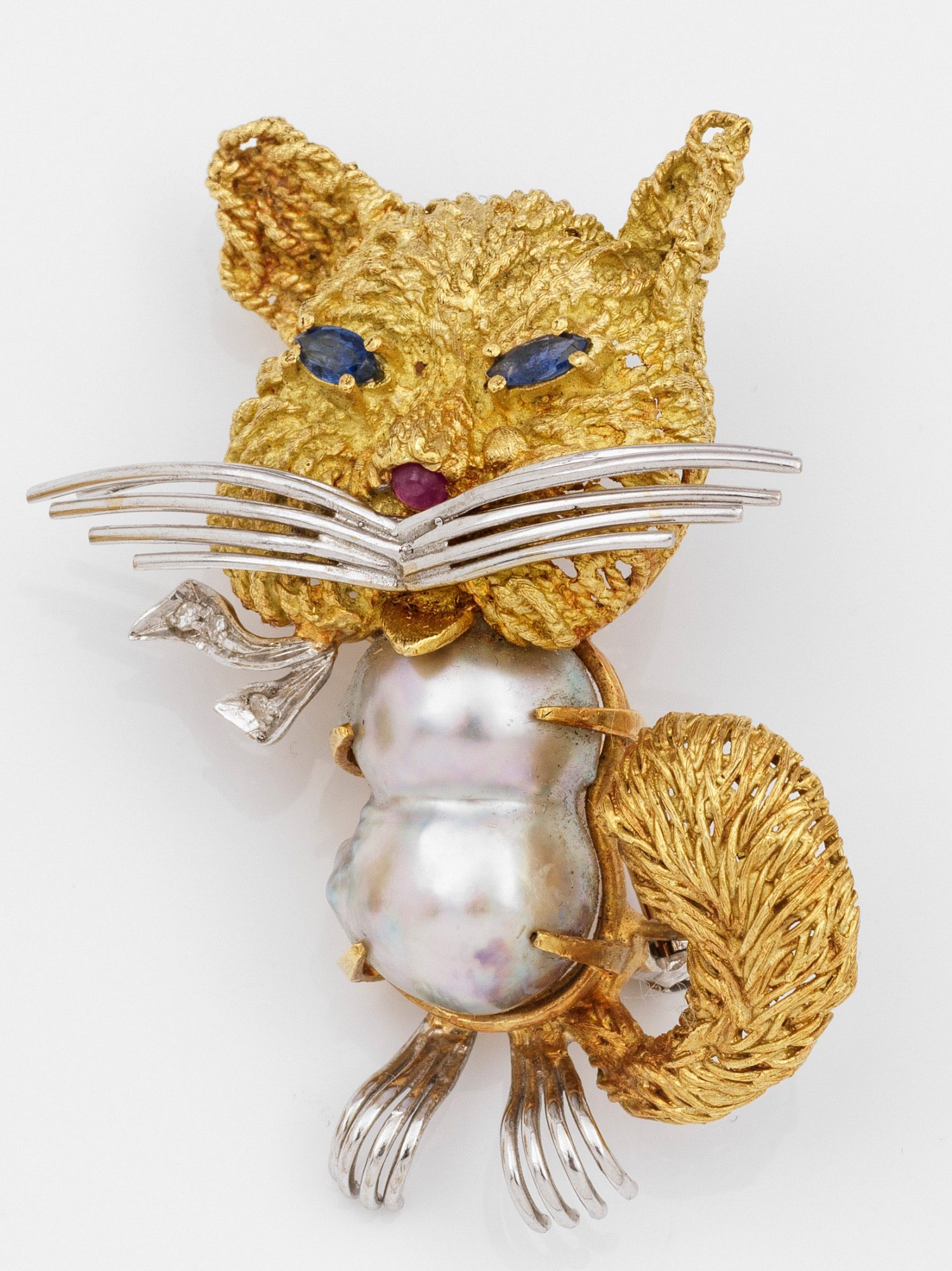 Cat brooch by Toliro, Italy, set with a culture pearl, ruby, sapphires and diamonds, in 18 k white and yellow gold. Manufacturer's mark.