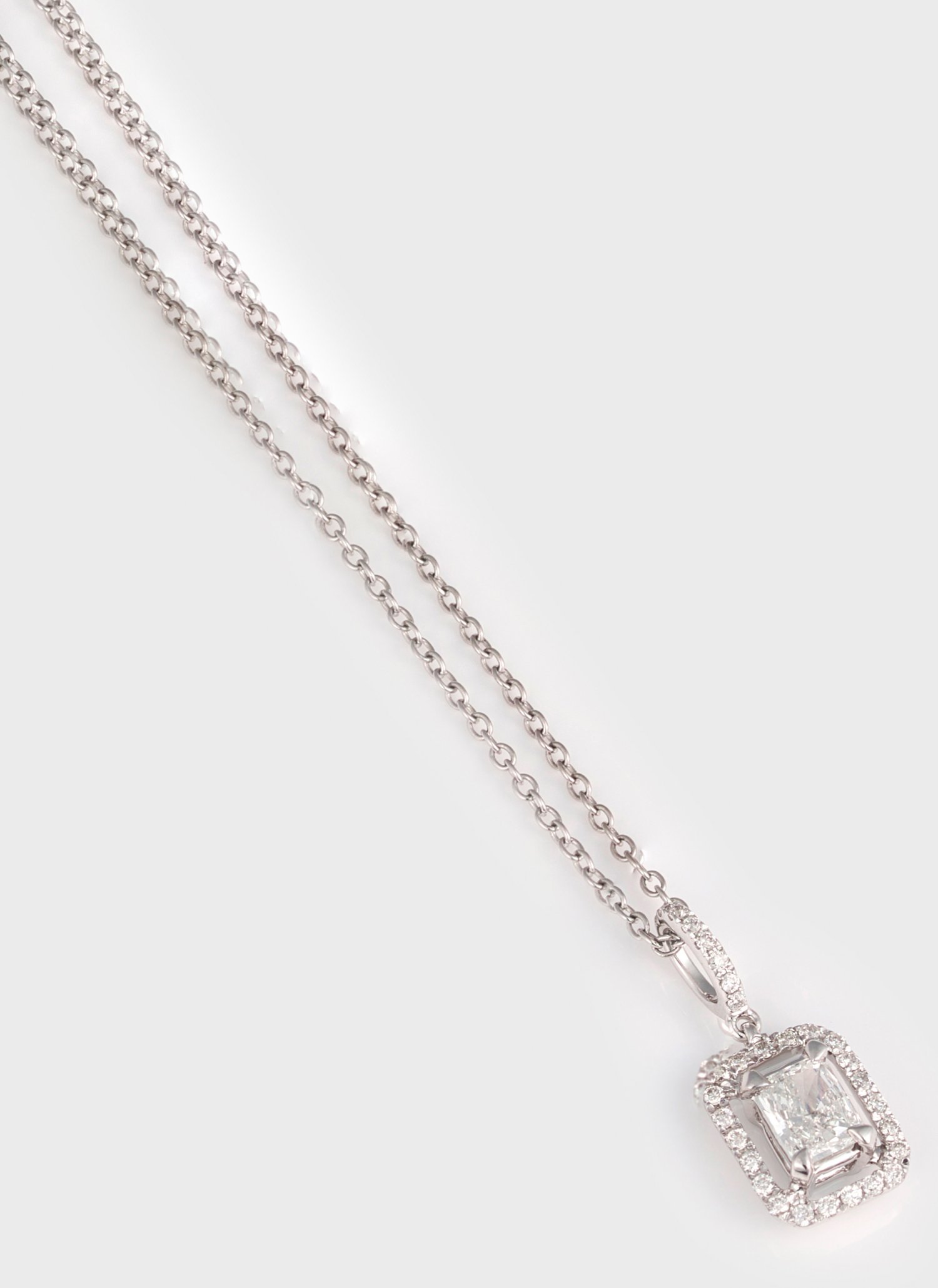 Weißgold, gest. 750. An feiner sog. Erbsenkette mit abschließendem Anhänger, besetzt mit einem Diamanten von ca. 0,40 ct. (E/vvs) im Radiantschliff, entouriert von kleinen Brillanten von zus. ca. 0,20 ct.; Ges.-Gew. ca. 3,16 g.
