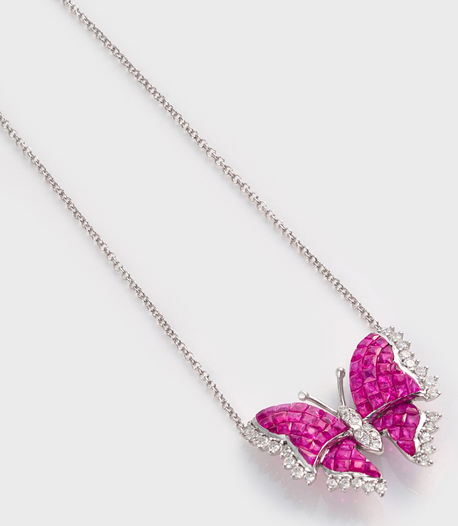 Butterfly necklace set with pigeon blood red rubies approx. 2,10 ct. and diamonds approx. 0,40 ct. (H/vs), in 18 k white gold.