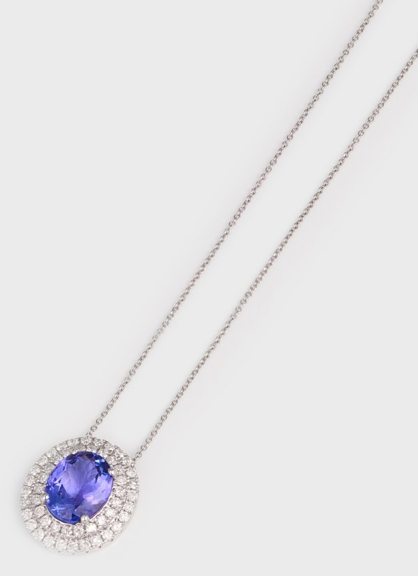 Weißgold, gest. 750. Sehr feine Gliederkette mit abschließendem Anhänger, zentral besetzt mit einem blauvioletten Tansanit von ca. 2,37 ct., entouriert von Brillanten von zus. ca. 0,57 ct. (H/si). Ges.-Gew. ca. 3,75 g.