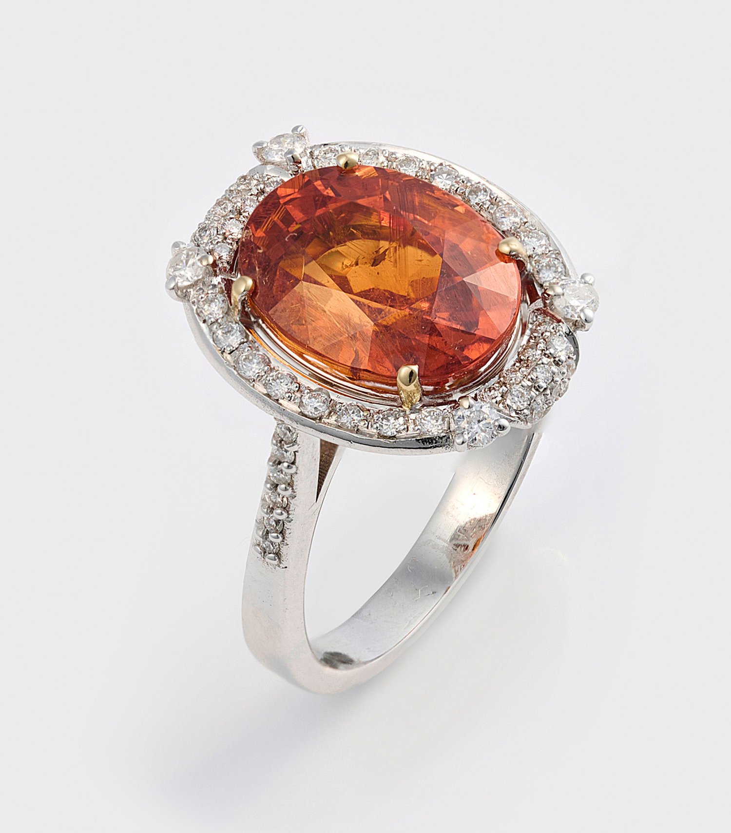 Weißgold, gest. 750. Zentral besetzt mit einem unbehandelten orange-gelben sog. "Fanta Orange"-Spessartin von ca. 7,05 ct. im Ovalschliff, entouriert von Brillanten von zus. ca. 0,40 ct.; Gew. ca. 6,28 g.