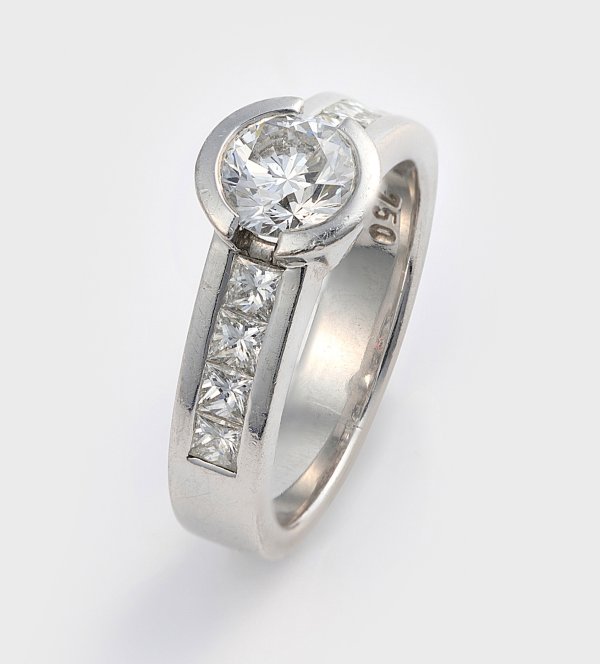 Weißgold, gest. 750. Zentral besetzt mit einem Brillantsolitär von ca. 0,90 ct. (G-H/vs), flankiert von Diamanten im Princesscut von ca. 0,40 ct.; Gew. ca. 8,13 g.