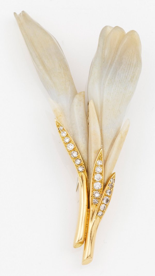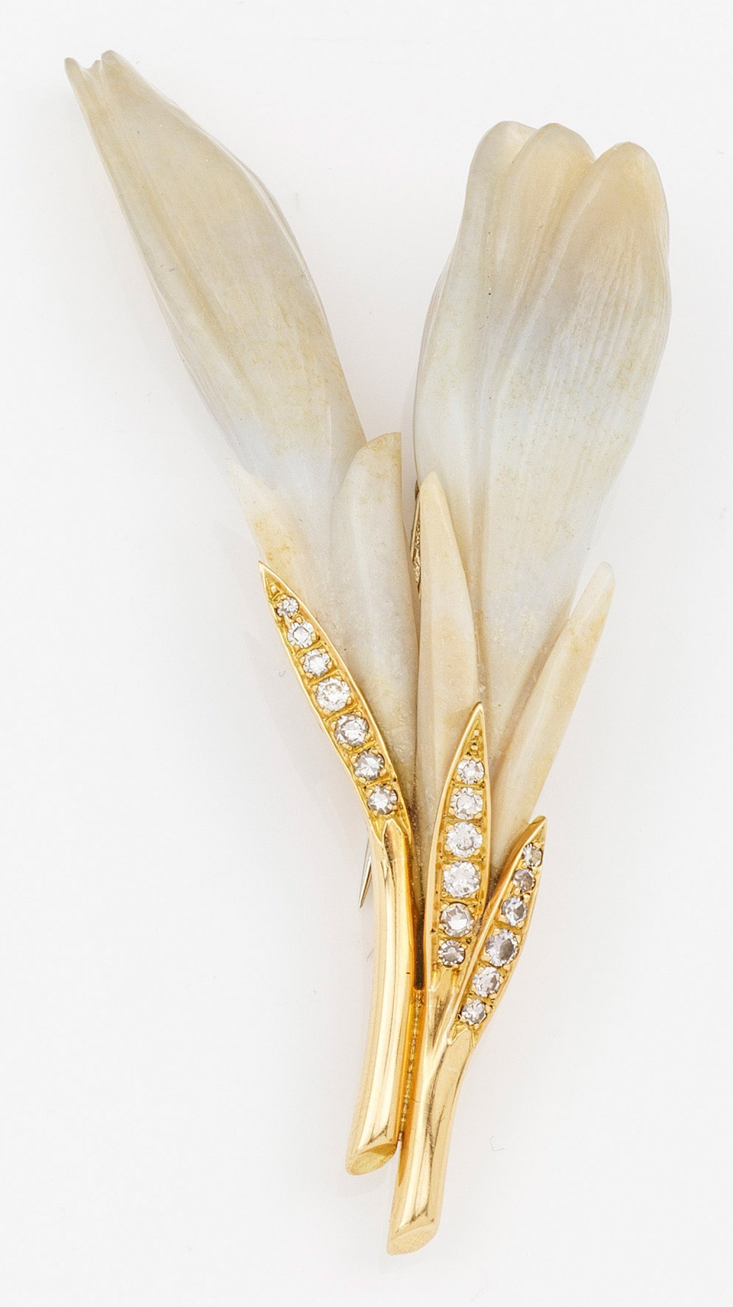 Gelbgold, gest. 750. Plastisch geschnitzte Krokusblüte aus Achat, akzentuiert durch 8/8 Diamanten von zus. ca. 0,30 ct.; Gew. ca. 23,12 g.