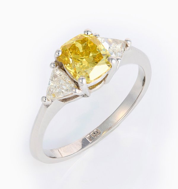 Weißgold, gest. 750. Zentral besetzt mit Fancy Vivid Yellow-Diamanten von ca. 1,35 ct. (vs1) im Cushioncut, flankiert von Diamant-Trillanten von zus. ca. 0,50 ct. (E/vs1-2). Gew. ca. 3,11 g.