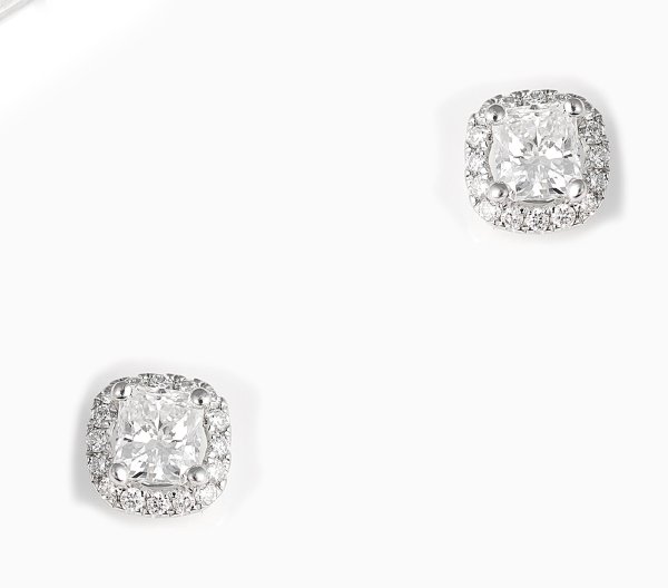 Weißgold, gest. 750. Zentral besetzt mit 2 Diamanten von zus. ca. 0,76 ct. (D-E/vs) im Princesscut, entouriert von kleinen Diamanten von zus. ca. 0,36 ct.; Ges.-Gew. ca. 2,35 g.