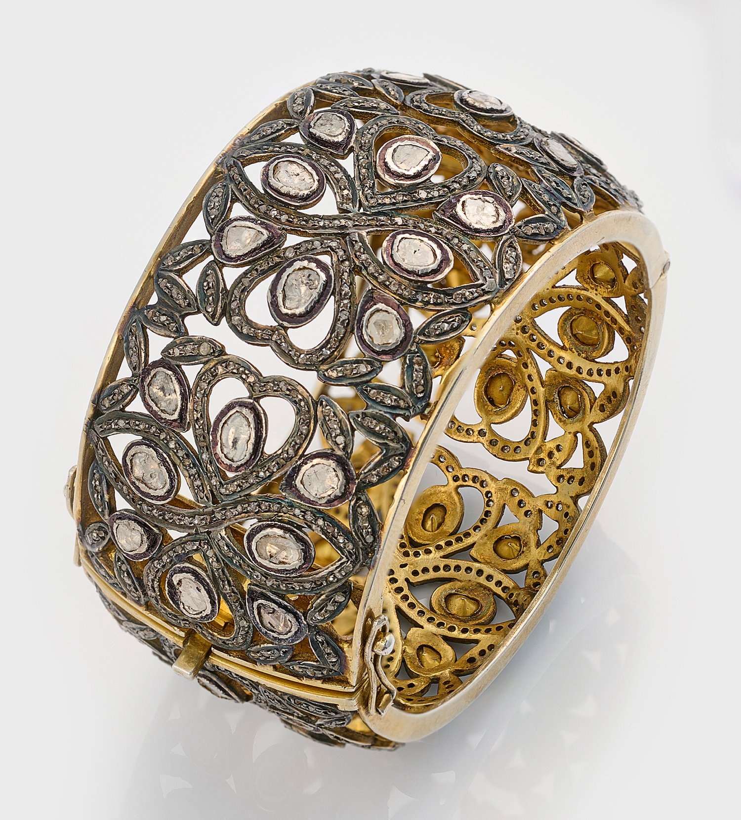 Silber, vergoldet, gest. 925. Breiter, leicht bombierter, floral durchbrochener Armreif, ausgefasst mit Diamantrosen von zus. ca. 9,00 ct.; Gew. ca. 89,53 g.