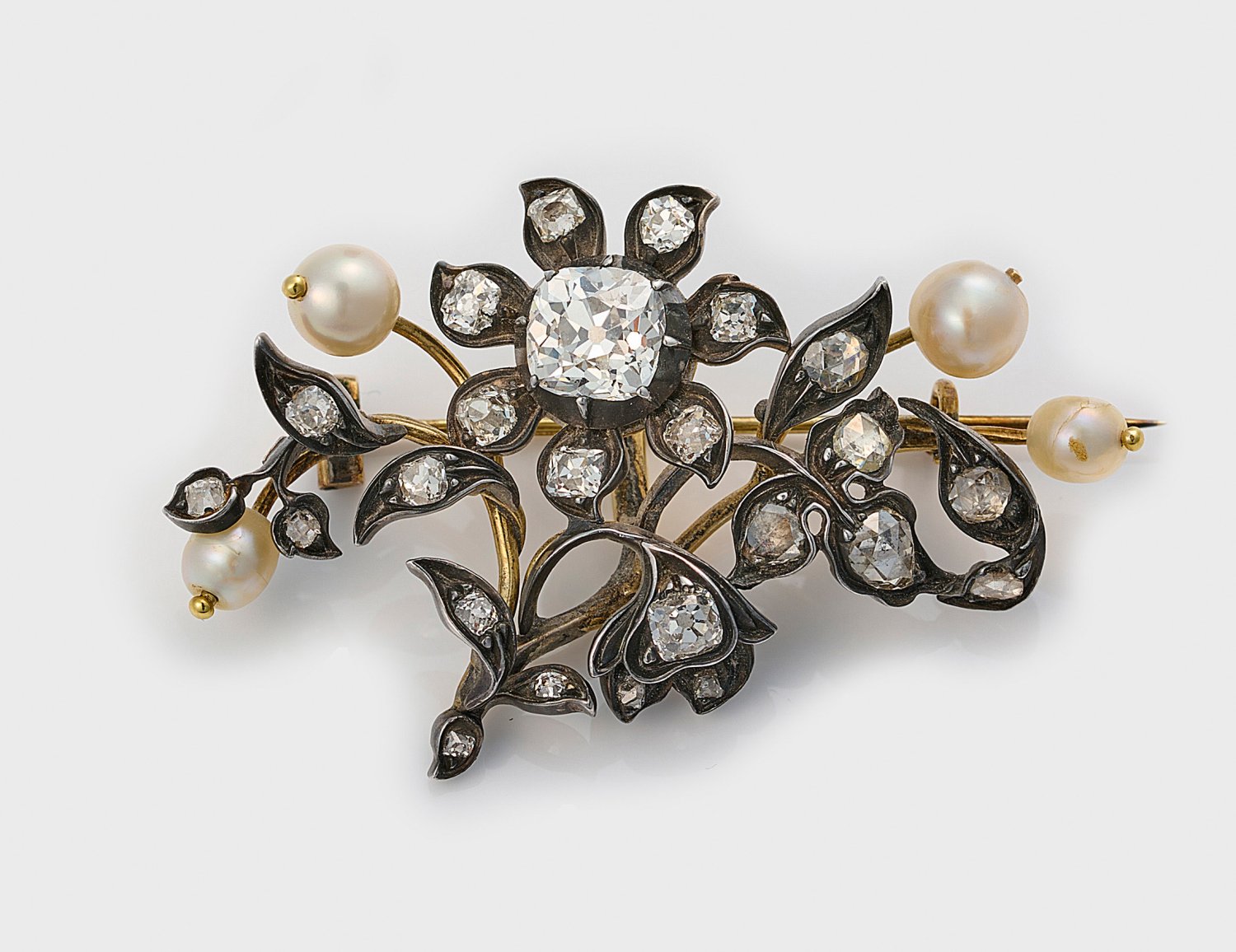 Brooch set with antique diamonds approx. 0,30 ct. and diamonds approx. 1,00 ct. (I-J/vvs/vs), natural orient pearls approx. 4,3 mm - 5,5 mm, in silver gold doubled. Examined by Gemologist Institute Hamburg.