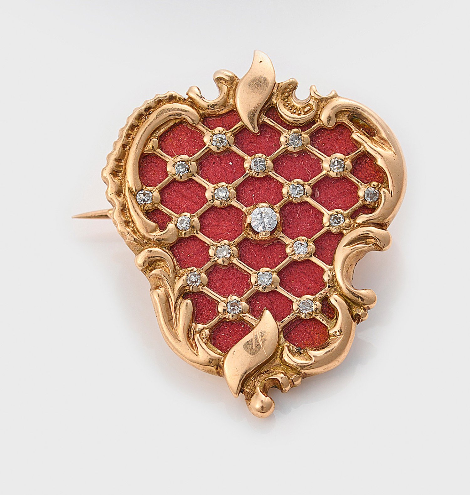 Roségold, gest. 56 (583), teilw. rot emailliert. In Form einer Kartusche mit feinem Gitterwerk, akzentuiert durch Altschliffdiamanten. Garantiestempel und Meistermarke GK. Auch als Anhänger tragbar. Gew. ca. 8,13 g.