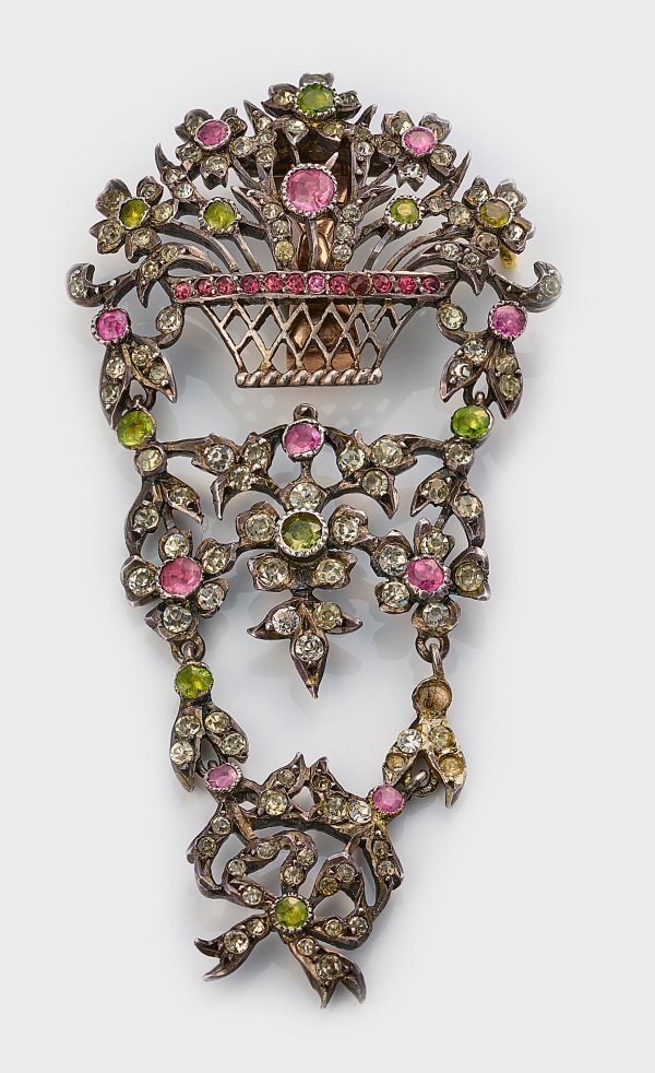Silber und Gelbgold, 8 k.; Beweglich und in Ajour gearbeiteter Korb mit üppigem Blumenbouquet besetzt mit Strasssteinen. Gew. ca. 16,9 g.