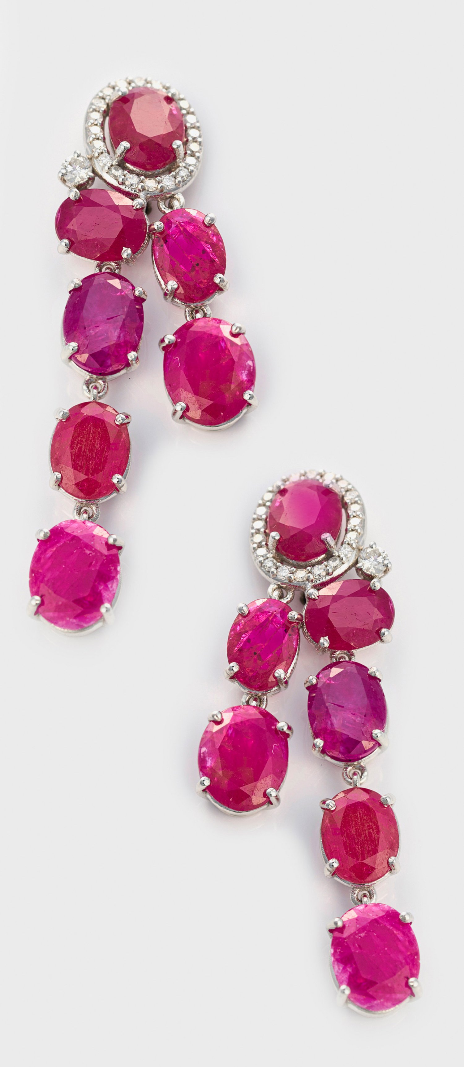 Pair of earrings set with pigeon blood red rubies approx. 22,26 ct. and small diamonds, in 18 k white gold. Certificate included.