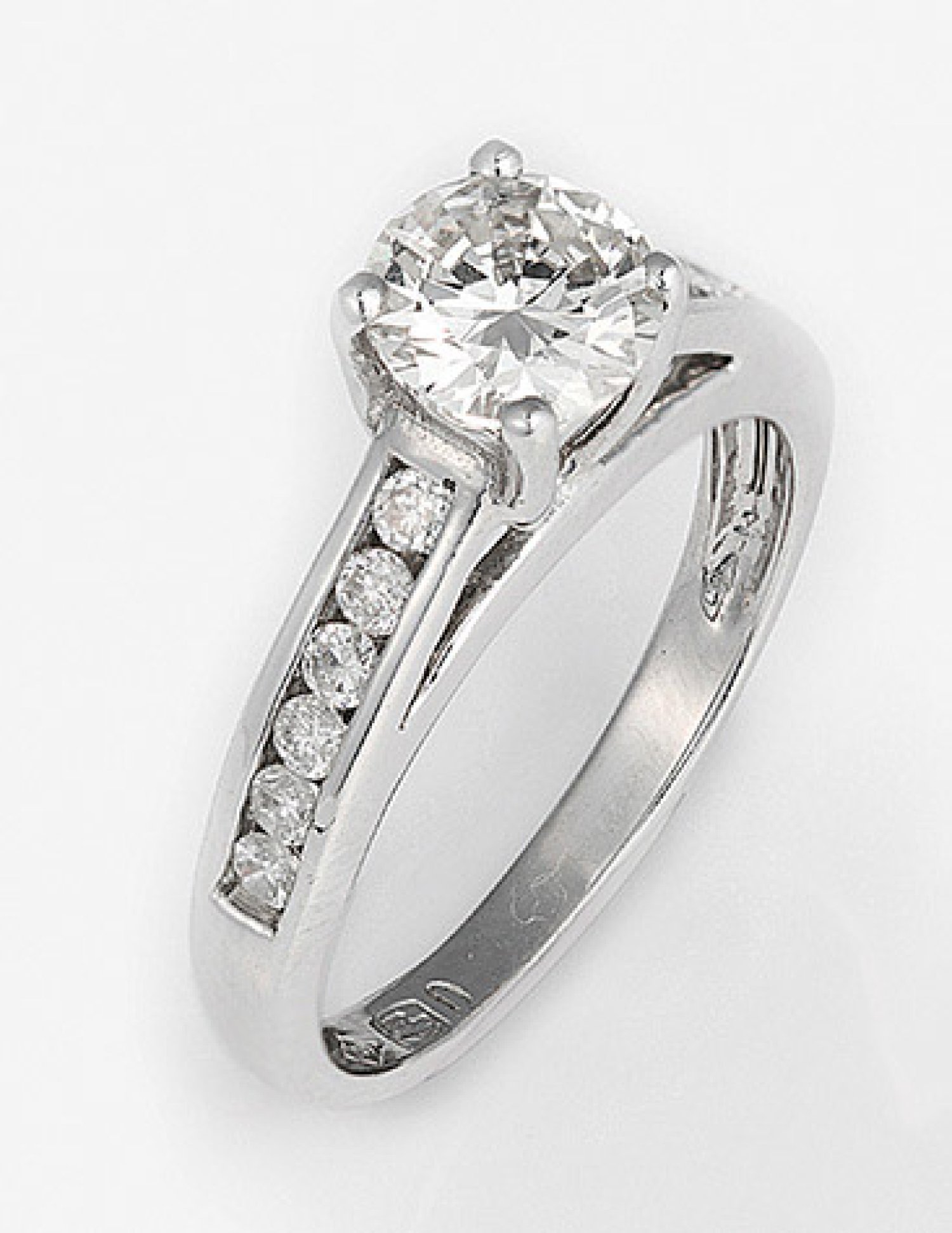 Weißgold, gest. 750. Zentral besetzt mit einem Brillanten von ca. 1,04 ct. (G/vsi), flankiert von Brillanten von zus. ca. 0,50 ct. Gew. ca. 4,36 g.