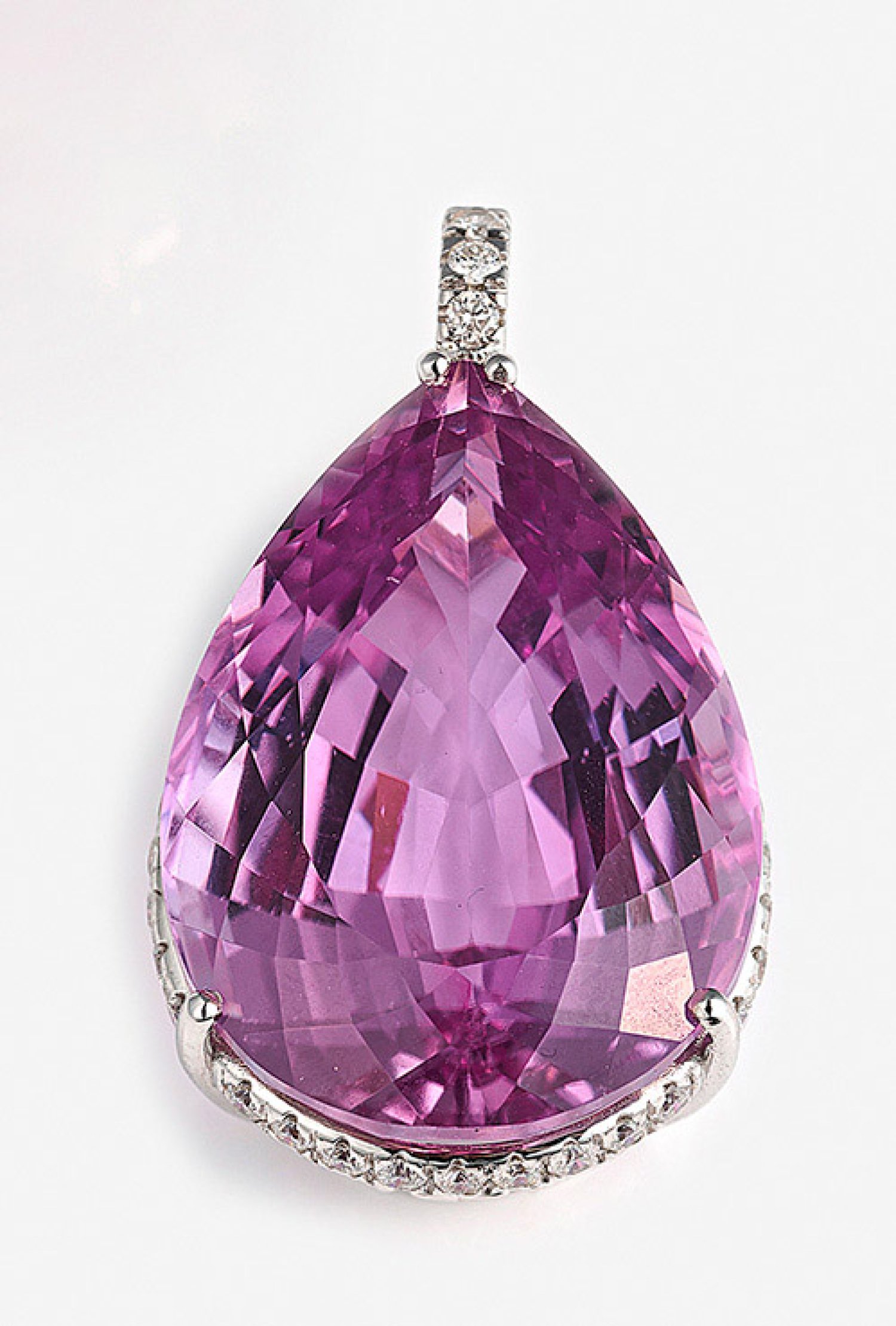Pendant set with a pink kunzite approx. 62,41 ct. and diamonds approx. 1,20 ct., in 18 k white gold. Certificate included.