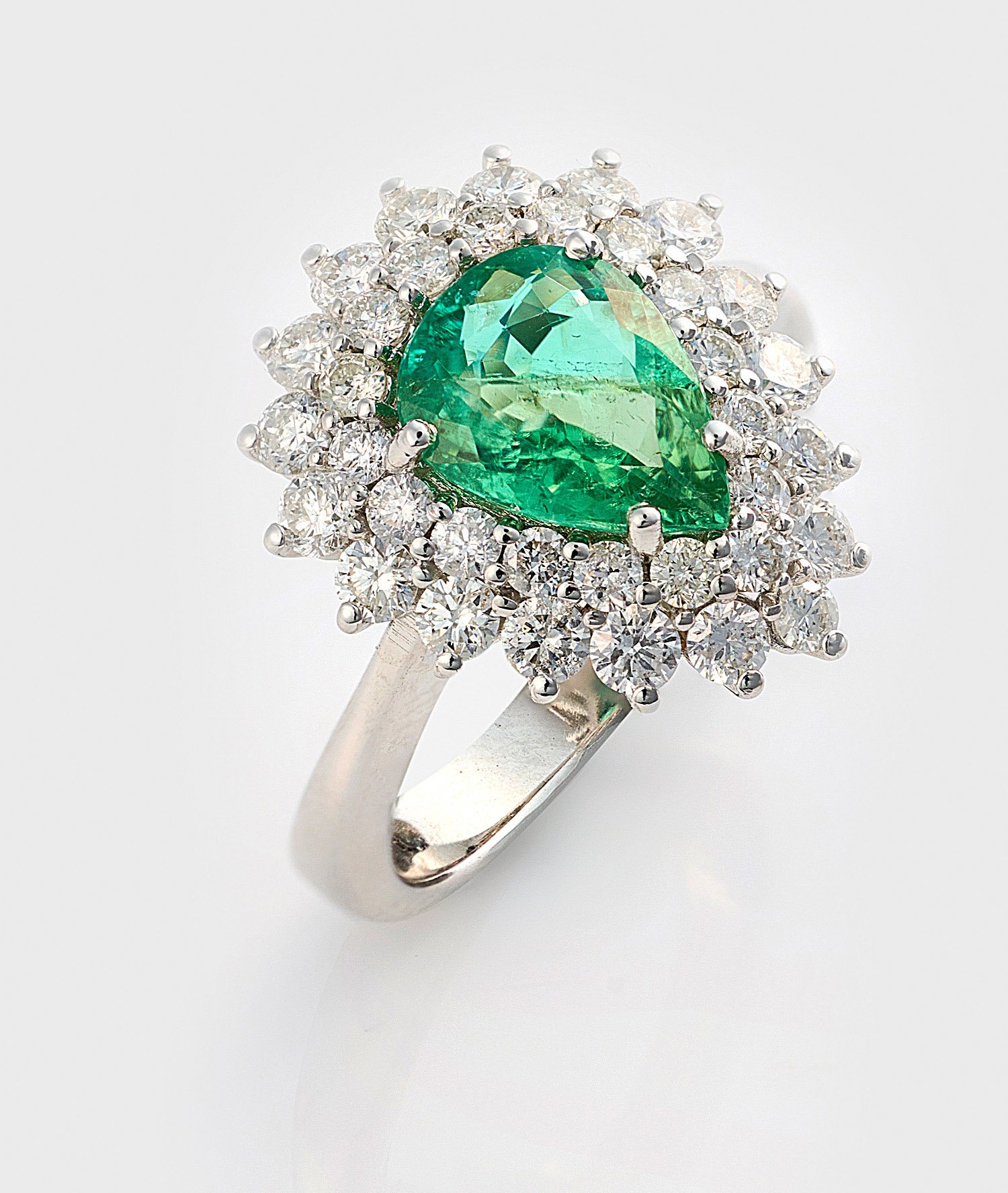 Weißgold, gest. 750. Besetzt mit einem Blue-Green Paraiba-Turmalin von ca. 2,06 ct. im Pearcut, entouriert von Brillanten von zus. ca. 1,43 ct.; Gew. ca. 7,25 g.