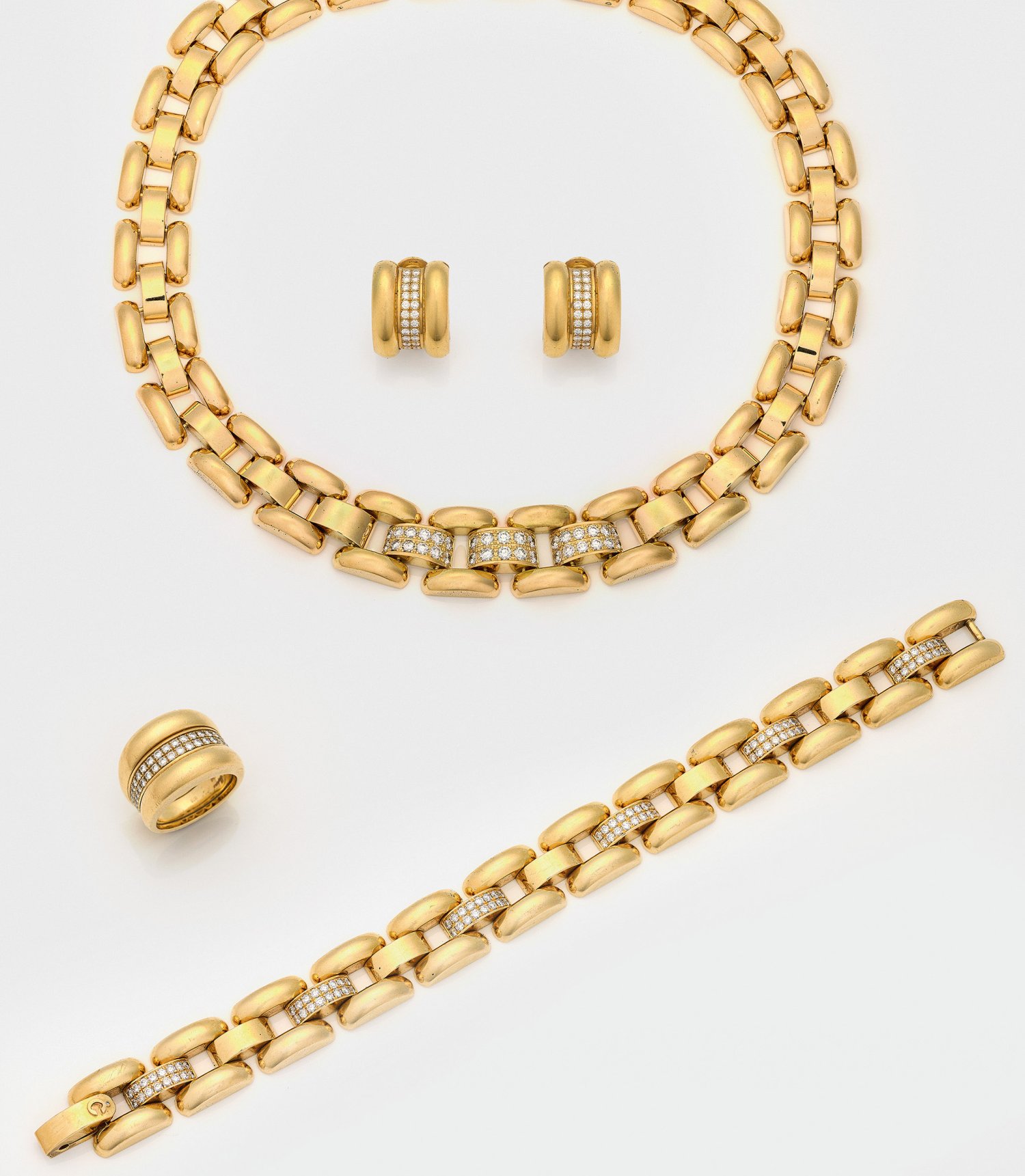 Collier, korrespondierendes Armband, Ring und Paar Ohrclips. Gelbgold, gest. 750. Besetzt mit Brillanten von zus. ca. 5,38 ct. (F-G/if). Herstellerzeichen. Ref.-Nr. 9139988, 2130350, 9304348, 82/6435-41, 9139988, 6435, 9148467, 81/2635-41, 9286. 2130350, 85/2672-41. Ges.-Gew. ca. 264,86 g. Original blaue, goldgeprägte Lederbox und Zertifikate.