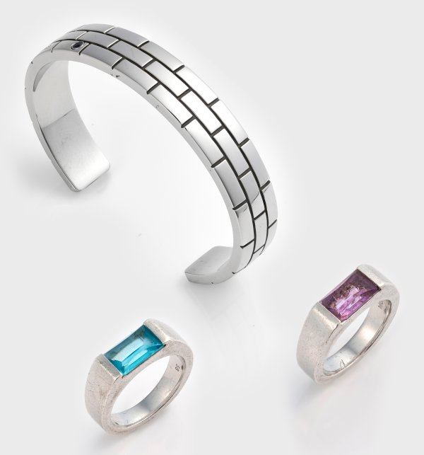 Armreif, korrespondierendes Armband und 2 Ringe. Silber, Stahl, gest. 925. Besetzt mit Farbsteinen. Ges.-Gew. ca. 94,25 g.