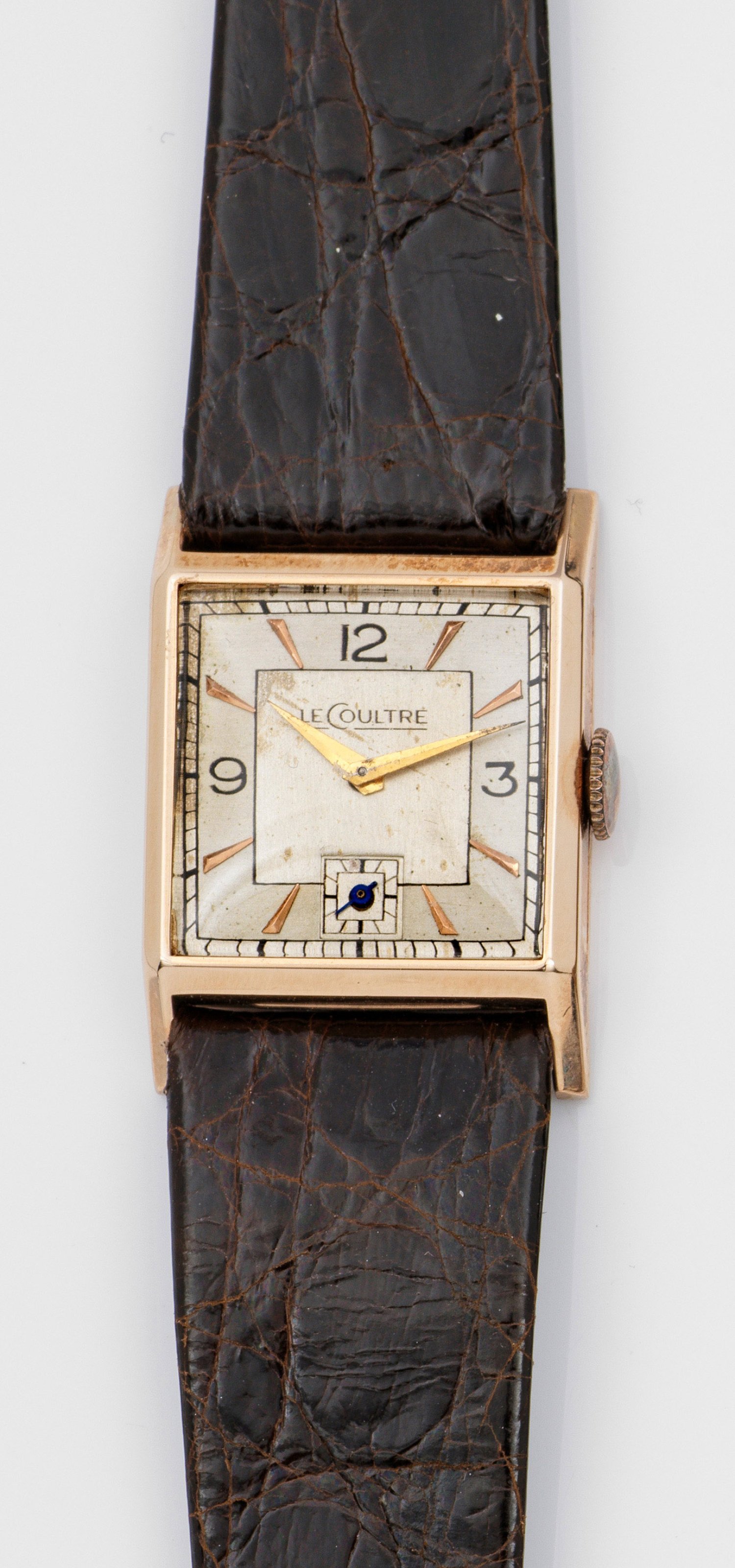 Roségold, gest. 14 ct.; Quadratisches Uhrengehäuse, satiniertes zweifarbiges Zifferblatt, aufgelegte Gold-Indexe und arabische Zahlen, Lanzenzeiger, kleine Sekunde. Braunes Krokodilleder-Armband. Mechanisches Werk mit Handaufzug. Herstellerzeichen. Ref.-Nr. 910244. Gew. ca. 15,89 g. Original box.