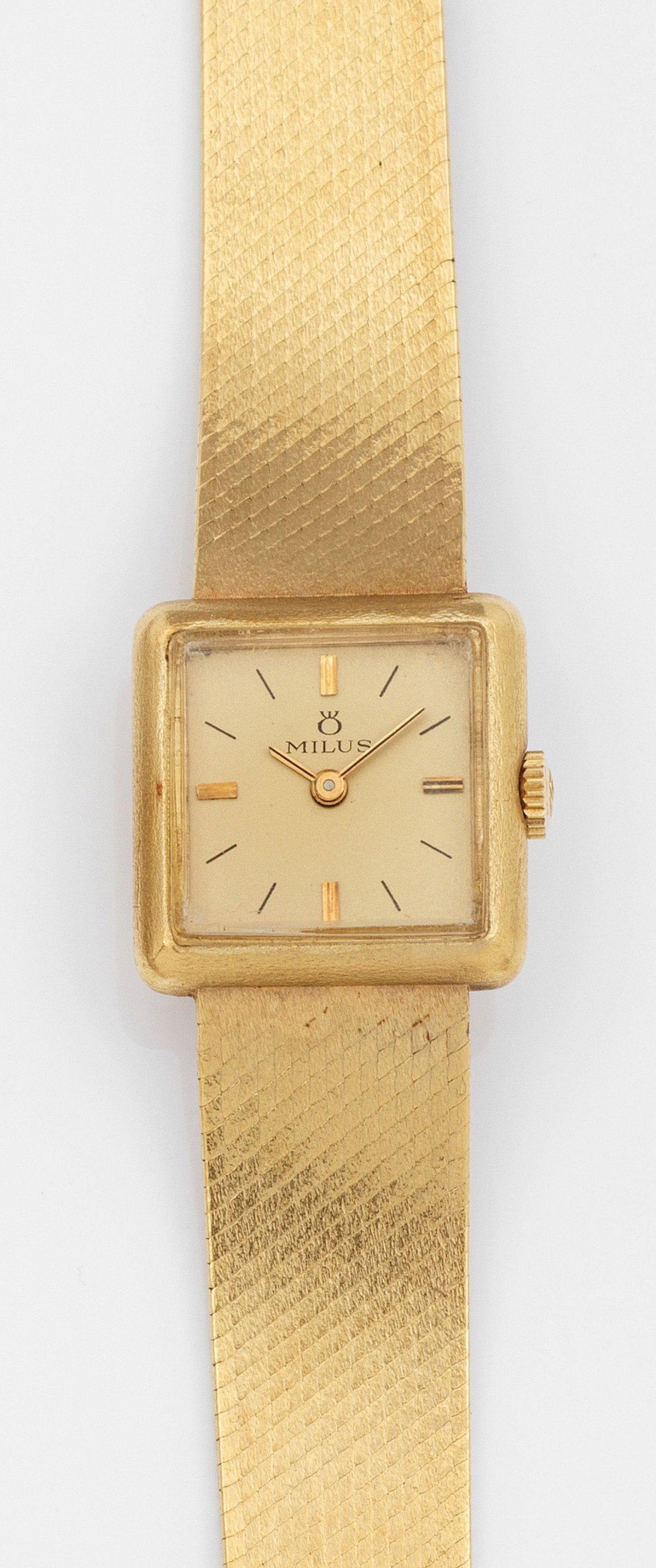 Lady's wristwatch by MILUS, mechanical movement, in 18 k gold. Maker's mark.