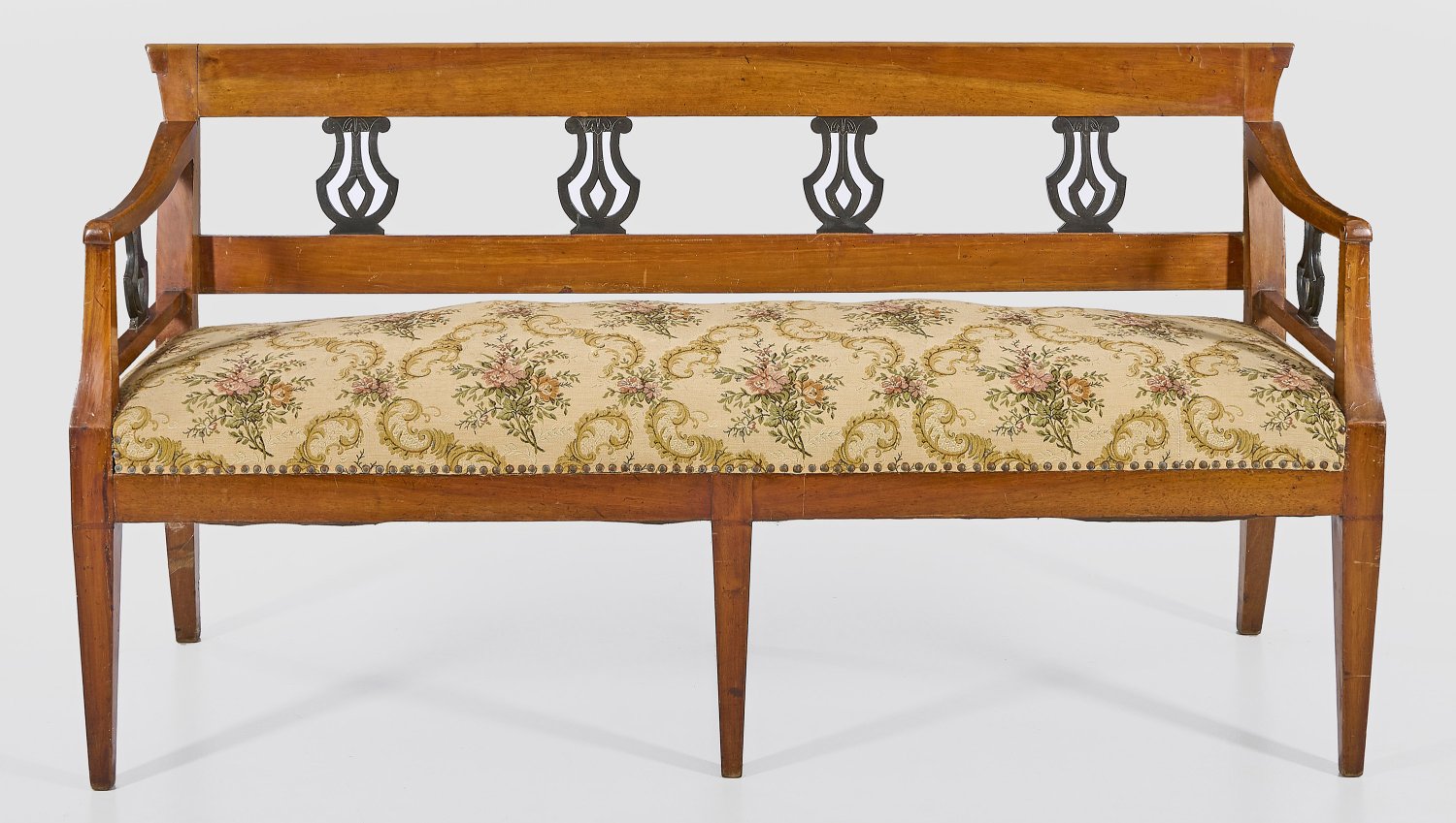 Nussbaum, teilw. ebonisiert. Gerade Zarge auf konischen Vierkantbeinen, in geschweifte Stützen für schmale Armlehnen übergehend. Gerade Rückenlehnenrahmung mit durchbrochen gearbeiteten stilisierten Lyraelementen. Sitzfläche gepolstert und bezogen. H. 84 cm. 161 cm x 57 cm. Sitz-H. 49 cm.