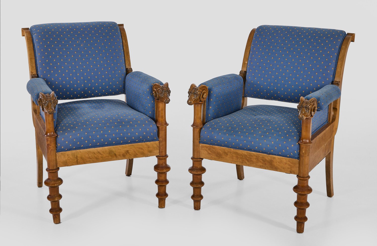 Birkenholz, teilw. reliefplastisch geschnitzt. Gerade Zarge auf mehrfach gegliederten Balusterbeinen, in entsprechende Stütze für gerundete Armlehnen mit vollplastisch gestalteten Widderköpfen übergehend. Rechteckige, weit zurückschwingende Rückenlehne. Allseitig gepolstert und bezogen. H. 90 cm. 65 cm x 80 cm. Sitz-H. 50 cm.