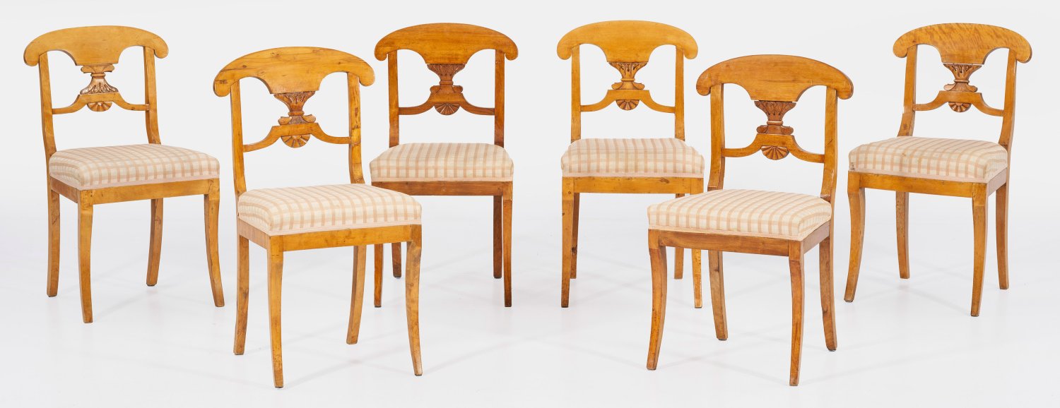 A set of six German birchwood Biedermeier chairs.