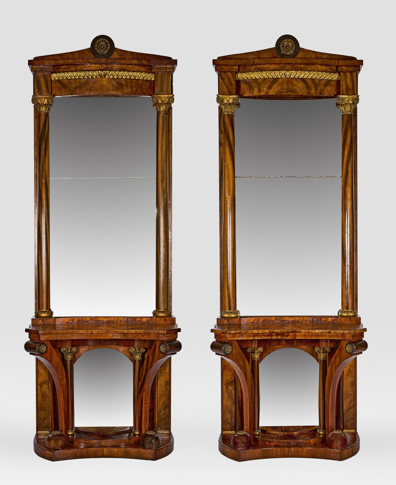 Nussbaum und karelische Birke, furniert mit Einlagen aus unterschiedlichen Hölzern sowie Holz, geschnitzt, gefasst und vergoldet. Über konkav eingezogener, gestuft ansteigender Sockelplatte verspiegelte Rückwand sowie weit zurückgesetzte Vollsäulen und sich konisch verbreiternde Volutenstreben als Träger für korrespondierende Zarge und gering überstehende Deckplatte. Hoher, aufgestellter Spiegelaufsatz aus gerader Rahmung, flankiert von eingestellten Dreiviertelsäulen mit ionischen Kapitellen. Oberhalb bombiertes Gesims mit plastisch gearbeitetem Eichblattfries sowie gestuft ansteigendem Gesims mit zentraler Bekrönung aus einem Tondo mit applizierter Reliefrosette aus Messing. Zweigeteiltes Spiegelglas. Ges.-H. 274 cm. 99 cm x 45 cm.