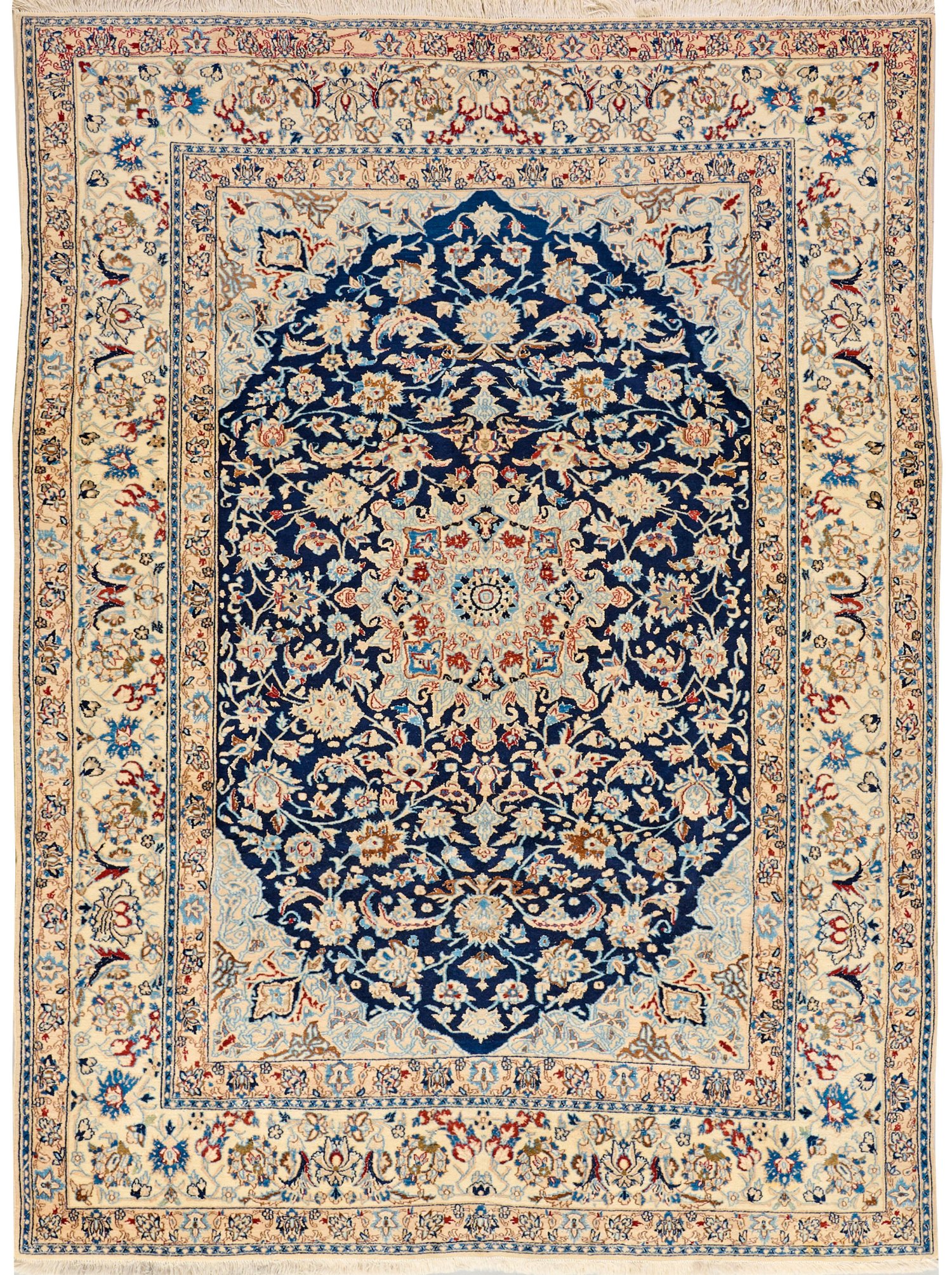 Persien. Korkwolle mit Seide auf Baumwolle. Feine Knüpfung. Im dunkelblauen Innenfeld hellblaues Zentralmedaillon sowie passig geschweifte, korrespondierende Ecklösungen. Flächendeckende Musterung aus Palmettenranken. Umlaufend breite, beigefarbene Bordüre mit entsprechendem Dekor, flankiert von schmalen Bändern. 245 cm x 169 cm.