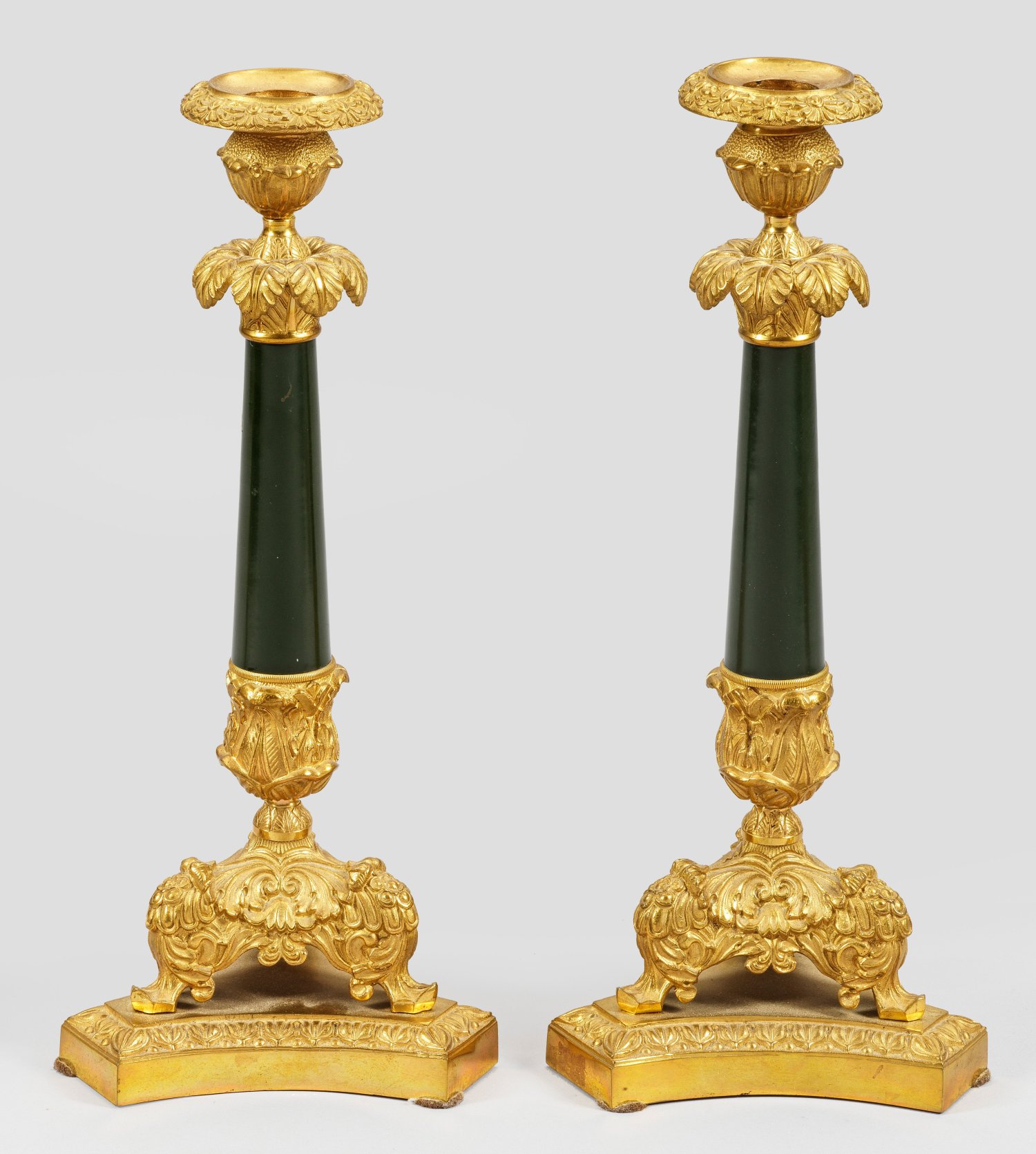 1-flg.; Bronze, vergoldet und teilw. moosgrün lackiert. Über dreiseitig konkav eingezogenem Sockel mit Palmettenfries geschweift ansteigende Basis aus reliefierten Voluten. Oberhalb davon ausgehend konischer Schaft als Träger für vasenförmige Tülle. H. 24,5 cm.