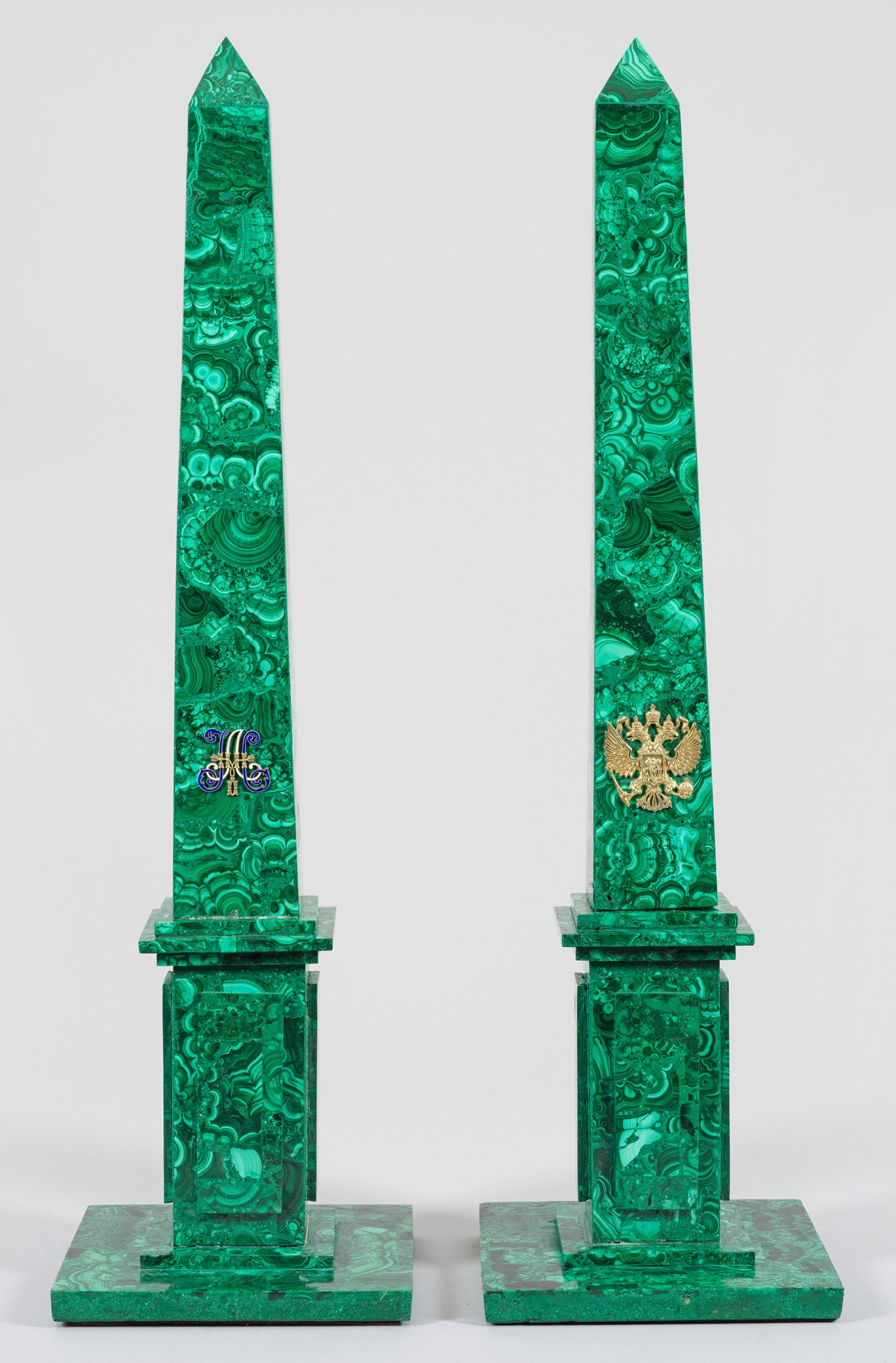 A pair of representative and large Russian malachite obelisks, set with a gilt silver imperial eagle. Standard mark 84.