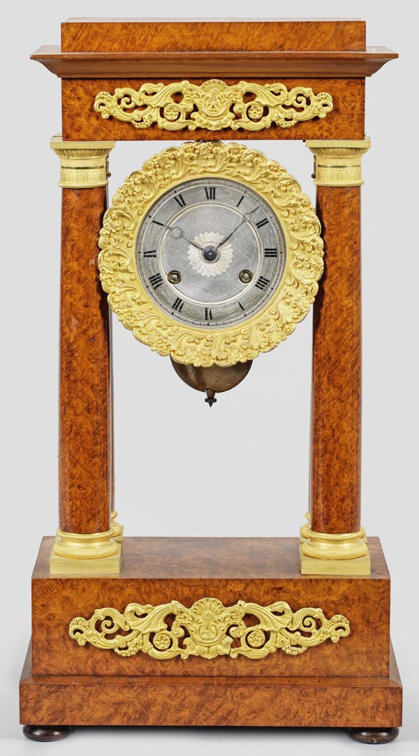 Amboinamaser, furniert sowie Einlagen aus Ahorn und vergoldete Bronze. Architektonisch gegliedertes Gehäuse aus konischen Vollsäulen auf gekanteter Basis als Träger für breit gerahmtes Zifferblatt. Pendulenwerk mit Pendelfeder und Halbstundenschlag auf Glocke. H. 45 cm. 24 cm x 13 cm.
