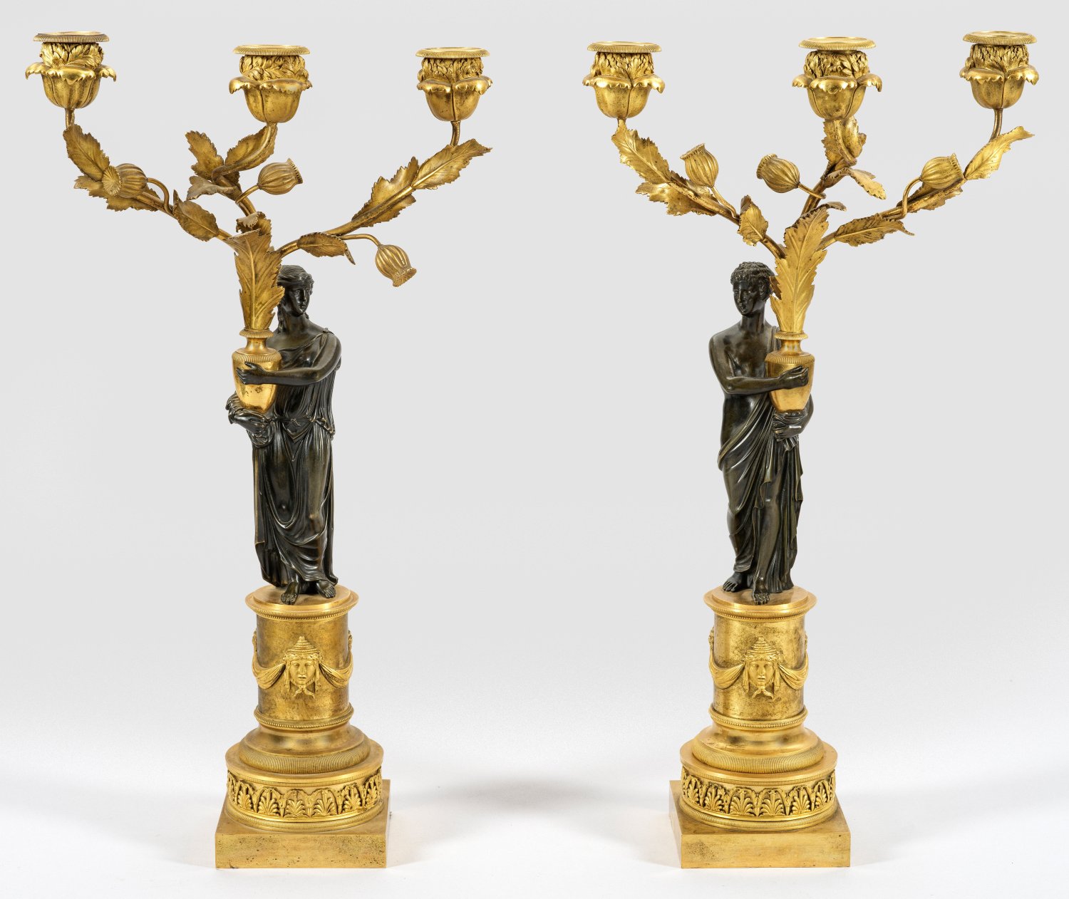 Gegenstücke. 3-flg.; Bronze, vergoldet und teilw. dunkel patiniert. Über quadratischer Plinthe gedrückter Rundsockel mit umlaufendem Fries aus erhaben reliefierten Palmetten. Oberhalb kurzer, zylinderförmiger Säulenschaft mit fein reliefierter, profilierter Basis sowie applizierten, erhaben reliefierten Maskarons, durch Draperiewerk verbunden. Vollplastische Darstellung von antikisierend gekleidetem Paar, jeweils eine Balustervase haltend. Davon ausgehend stark geschwungene Leuchterarme mit Blattwerk und plastischen Mohnkapseln sowie blütenförmigen Tüllen. H. 59 cm.
