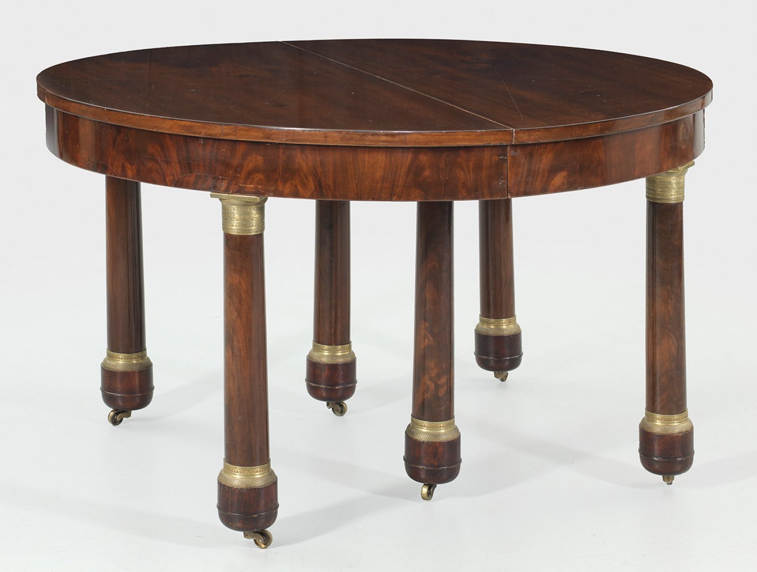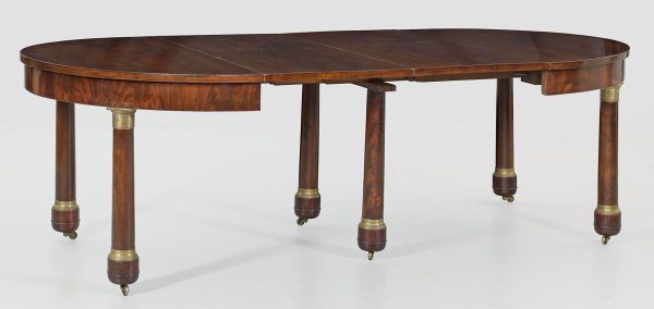 Mahagoni, massiv und furniert. Leicht konische Vollsäulen mit reliefierten Basen und Kapitellen auf Rollen als Träger für bombierte Zarge und gering überstehende Deckplatte. Dazu fünf erg. Einlegeplatten. H. 78 cm. 120 cm x 135/415 cm.