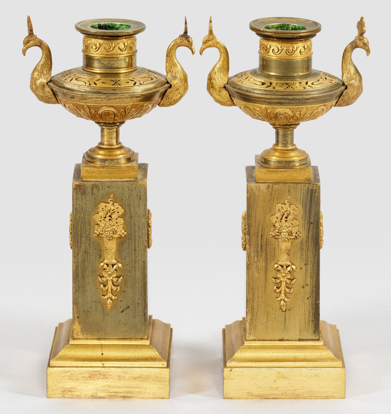 Bronze, vergoldet. Über quadratischer, umlaufend profilierter Plinthe hoher Podestsockel mit applizierten, erhaben reliefierten Kranzmotiven bzw. Körben mit Weinreben. Oberhalb gedrückte, teilw. ornamental durchbrochen gearbeitete Balustervase mit reliefiertem Palmetten- und Wellenbandfries. Seitlich plastisch gestaltete Pfauenköpfe. H. 21 cm.