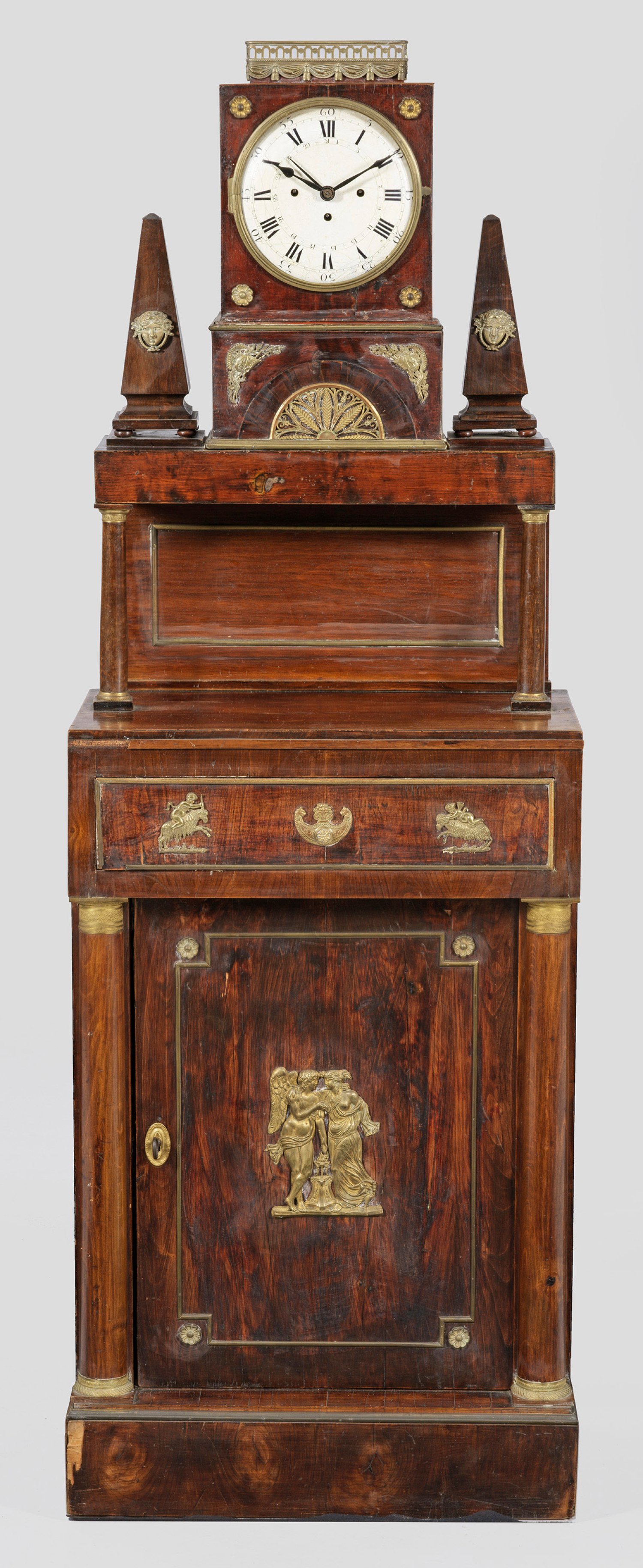 Mahagoni, furniert bzw. mahagonifarben gebeizt. Applikationen aus Messing. Über gekantetem Zargensockel gerader, hochrechteckiger Korpus. In der gegliederten Front Tür mit appliziertem Figurenrelief, flankiert von eingestellten Halbsäulen. Oberhalb leicht vorkragendes Schubfach. Zurückgesetzter Aufsatz, getragen von Vollsäulen als Träger für rechteckigen, gestuft ansteigenden Uhrenkorpus, flankiert von Obelisken. Besch. Zifferblatt mit Datumsanzeige. Messingwerk mit Fadenaufhängung sowie Viertelstundenschlag auf zwei Glocken. Repetition. Altersspuren und besch.; H. 159 cm. 54 cm x 30 cm.