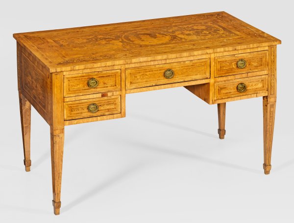 Nussbaum, furniert sowie Einlagen aus Ahorn und Rosenholz. Gerader, rechteckig angelegter Korpus auf konischen Vierkantbeinen. In der gegliederten Front gekantetes Kniefach, umgeben von fünf Schubladen unterschiedlicher Größe. Gering überstehende Deckplatte mit zentralem, figural eingelegtem Tondo. Allseitig breit gerahmte Furnierfelder mit intarsierten Blattranken und Chimären. Altersspuren. H. 78 cm. 129 cm x 64 cm.