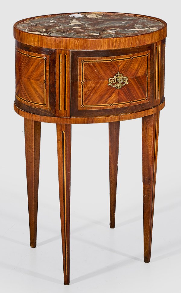 Rosenholz und Palisander, furniert. Bombierter, eintüriger Korpus auf hohen, konischen Vierkantbeinen. Flächendeckend breit gerahmte, gespiegelt angeordnete Furnierfelder, von ornamentierten Bandeinlagen begrenzt. Dem Korpus entsprechende, ovale Deckplatte aus rotbraunem, grauem und weiß gemasertem Marmor mit flacher Galerierahmung. Innen Teile alter Zinkauskleidung. H. 72 cm. 45 cm x 34,5 cm.