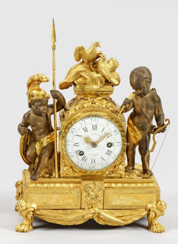 Bronze, fein ziseliert und feuervergoldet bzw. teilw. braun patiniert. Über querrechteckig angelegtem Sockel mit Palmettenfries und üppigem Draperiewerk auf Tatzenfüßen gekantetes Uhrengehäuse mit geschweift ansteigendem oberen Abschluss und Bekrönung in Form eines Taubenpaaren, flankiert von vollplastischen Genien des Krieges und der Liebe. Verglastes, besch. Emailzifferblatt, bez. Noël Baltazar à Paris. Pendulenwerk mit Fadenaufhängung sowie Halbstundenschlag auf Glocke. Platine ebenfalls bez. Noël Baltazar. H. 31 cm. 22 cm x 11 cm.