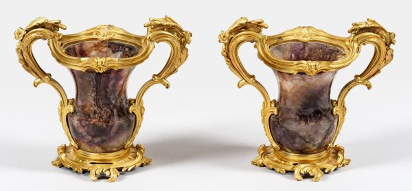 Violett- und beigefarben gemaserter, sog. "Blue John" Fluorit sowie Louis XV-Montierung aus feuervergoldeter Bronze. Über durchbrochen gearbeiteter Basis aus gegeneinander gestellten Blattvoluten, balusterförmiger Korpus mit weit ausladendem entsprechend profilgerahmtem Lippenrand. Seitlich stark geschwungene Henkel aus paarweise angeordneten Voluten und reliefplastischen Blüten. 1x unterhalb Sammlungsetikett "Collection Henri Gautier". H. 17,5 cm.