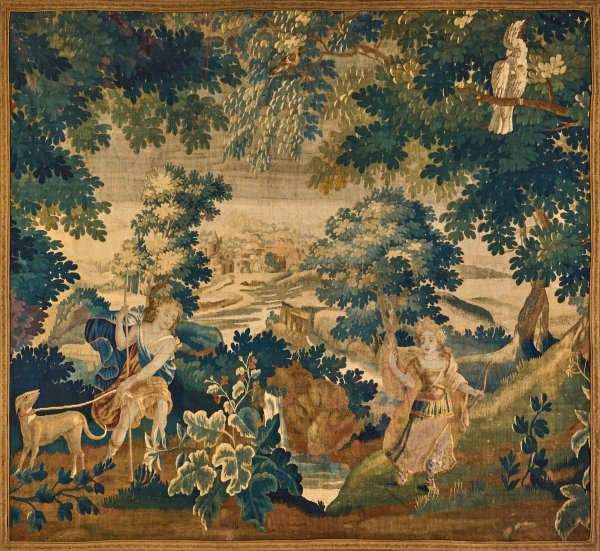 Wolle auf Wolle, flach gewebt. Im Spiegel flächendeckende Darstellung einer weiten Parklandschaft mit Flusslauf und Dorfansicht. Im Vordergrund antikisierend gekleidete Figurenstaffage mit Jagdhund und Bogen. Umlaufend schmale erg. Bordüre. Hinterlegt. 240 cm x 264 cm.