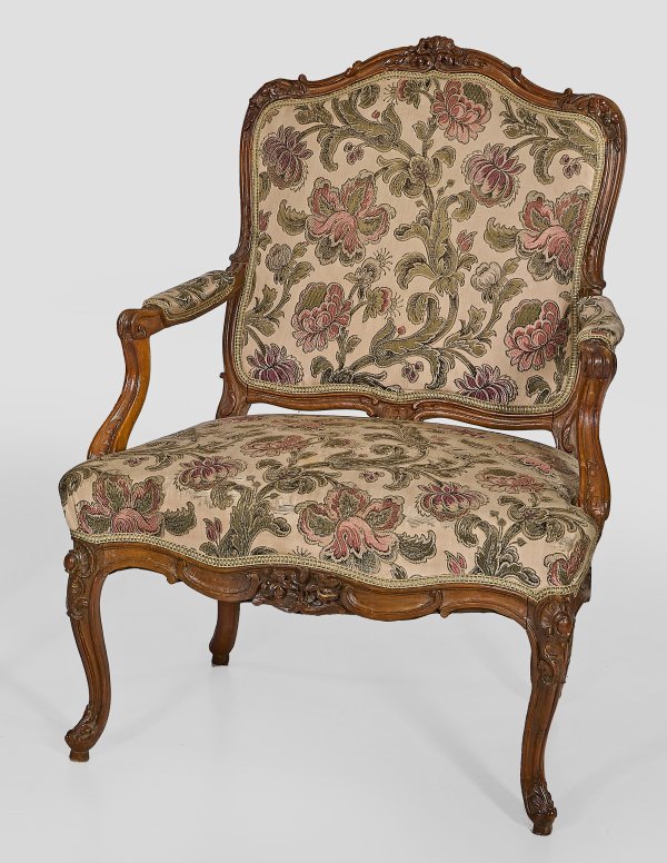 Nussbaum und Buchenholz, reliefplastisch geschnitzt. Passig geschweifte Zarge aus gegeneinander gestellten Voluten auf geschwungenen Beinen. Korrespondierende Stütze für schmale Armlehnen sowie schildförmige Rückenlehnenrahmung mit Blütenbekrönung. Gepolstert und bezogen. H. 98 cm. 70 cm x 56 cm. Sitz-H. 44 cm.
