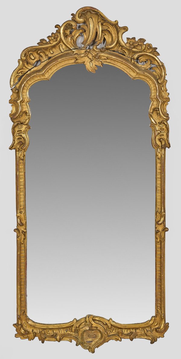 Holz, geschnitzt, gefasst und vergoldet. Gerade, hochrechteckige Spiegelrahmung aus gestreckten Voluten mit passig geschweiftem oberen Abschluss. Durchbrochen gearbeitete Bekrönung aus üppigen Rocaillen und Blattwerk sowie korrespondierender unterer Abschluss. 139 cm x 65 cm.