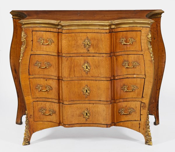 Nussbaum, furniert sowie teilw. geschnitzt, gefasst und vergoldet. Bombierter, seitlich konkav eingezogener Korpus, flankiert von schmalen, weit ausgezogenen Ecklisenen. In der gegliederten Front vier gegenläufig geschweifte Schubladen. Dem Korpus entsprechende, profilierte Deckplatte. Applikationen aus Bronze. Altersspuren. H. 84 cm. 108,5 cm x 51 cm.