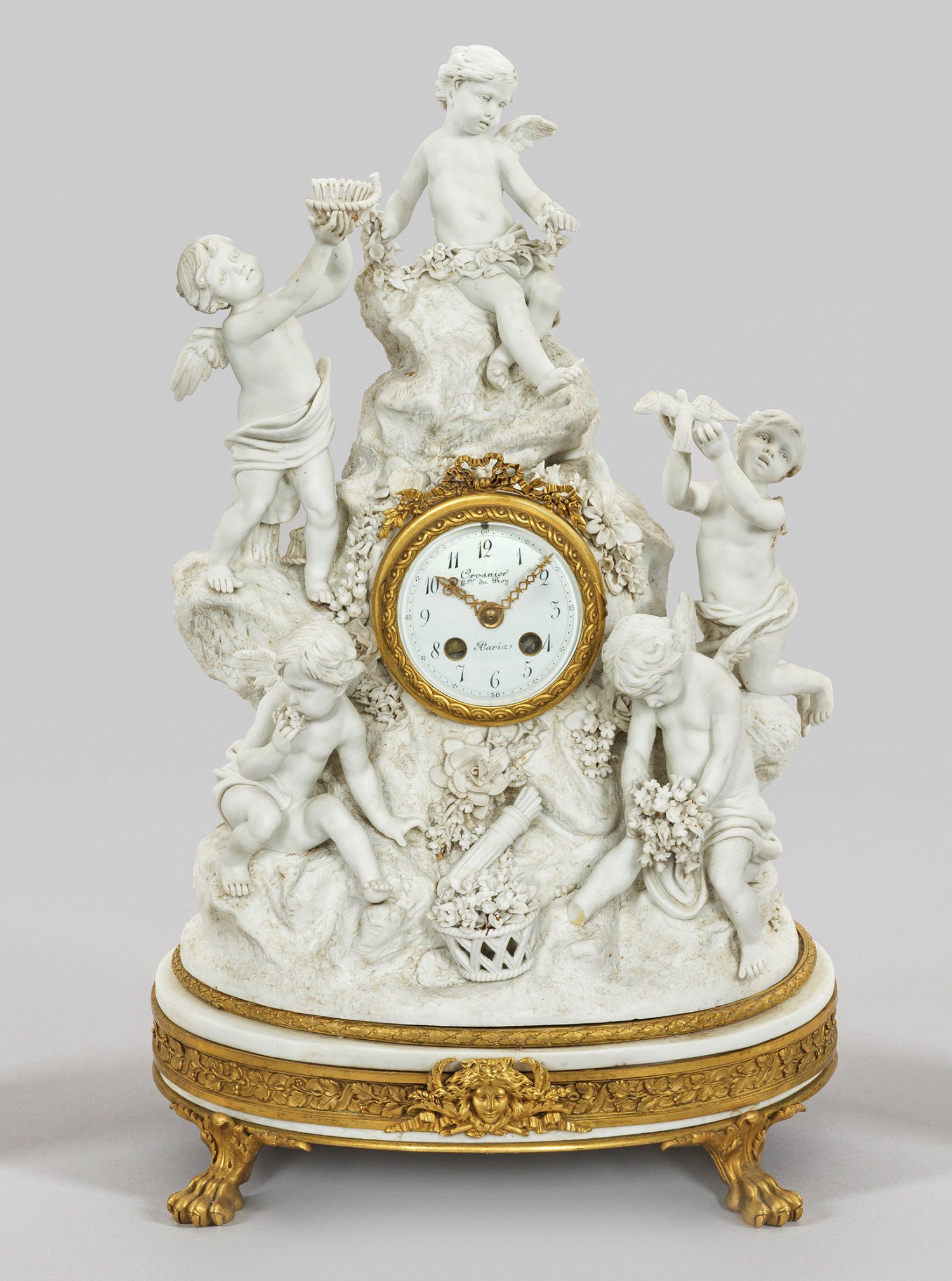 Biskuitporzellan und vergoldete Bronze. Über ovalem Sockel mit umlaufendem Fries aus Wellenband und Eichblatt auf plastischen Tatzenfüßen naturalistisch geformter Korpus in Form eines Felsens mit vollplastisch gestalteten Putti als Allegorie des Frühlings. Profilgerahmtes Zifferblatt, bez. Crosnier Hger. du Roy Paris. Erg. Quarzwerk. Am Sockel bez. Lagneau sowie Manufakturmarke mit AB. Besch.; H. 44,5 cm. 28 cm x 22 cm.
